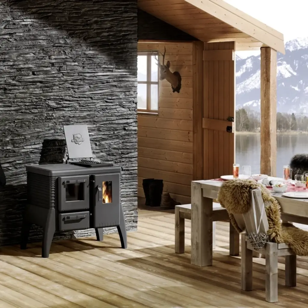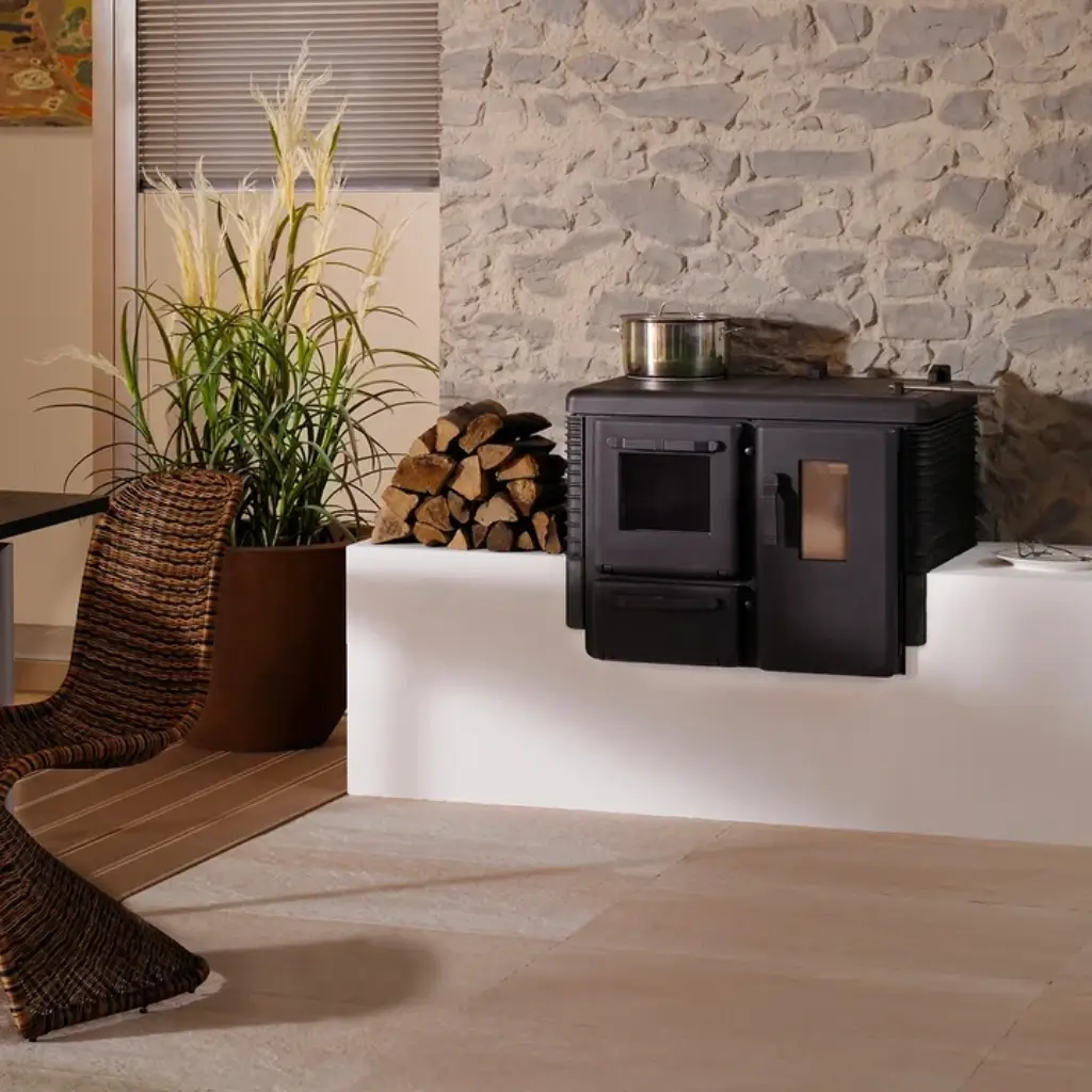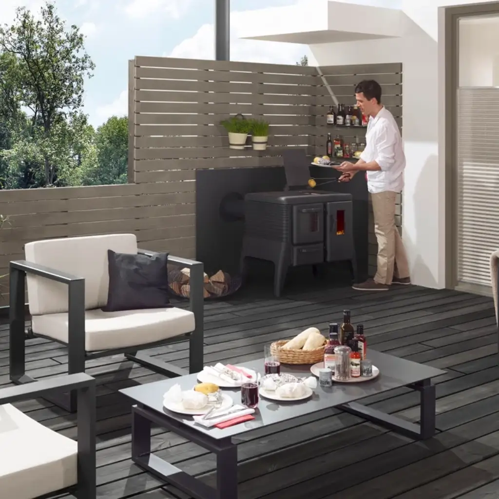 Den integrerade kokplattan på ovansidan gör det enkelt att laga mat direkt över elden, perfekt för allt från kaffe till långkok. Den inbyggda ugnen låter dig baka bröd, gratänger eller pizza med härlig vedeldad karaktär.