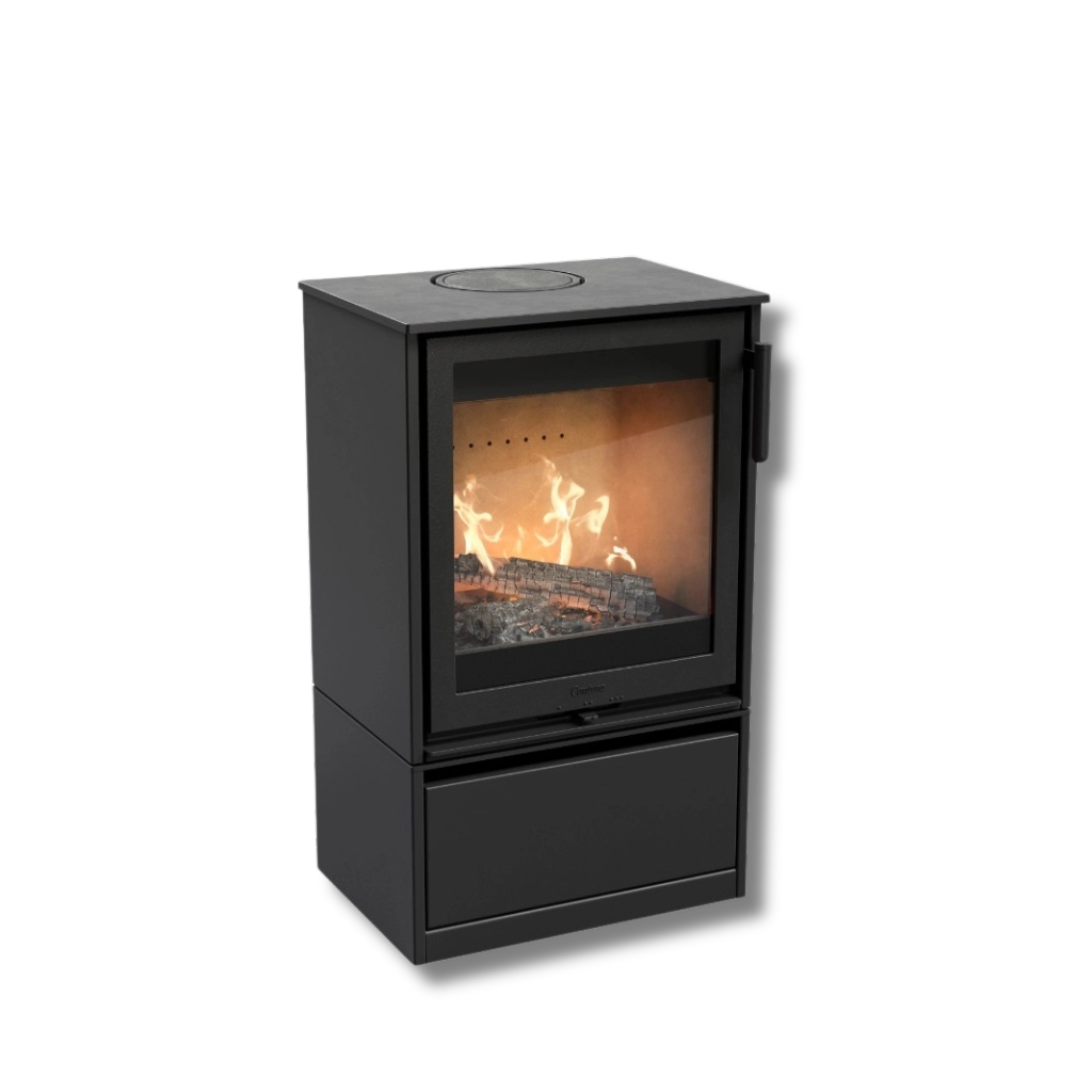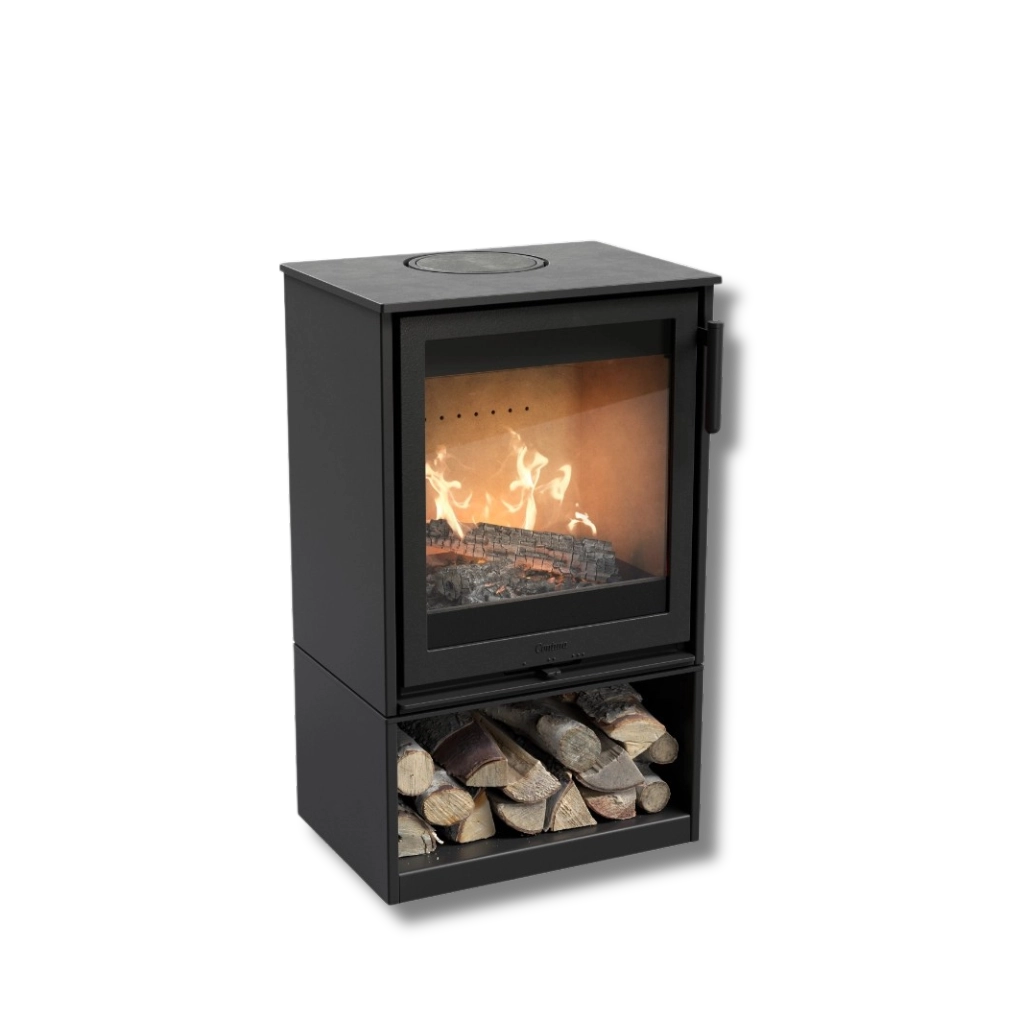 Contura 210 levereras med eleganta benstativ, men kan även monteras på ett matchande vedfack som tillval. Vedfacket finns i två varianter – med eller utan lucka – vilket ger dig möjlighet att skapa en snygg och funktionell helhet. Förutom att höja kaminen till en behagligare nivå fungerar vedfacket som praktisk förvaring för ved eller tillbehör.