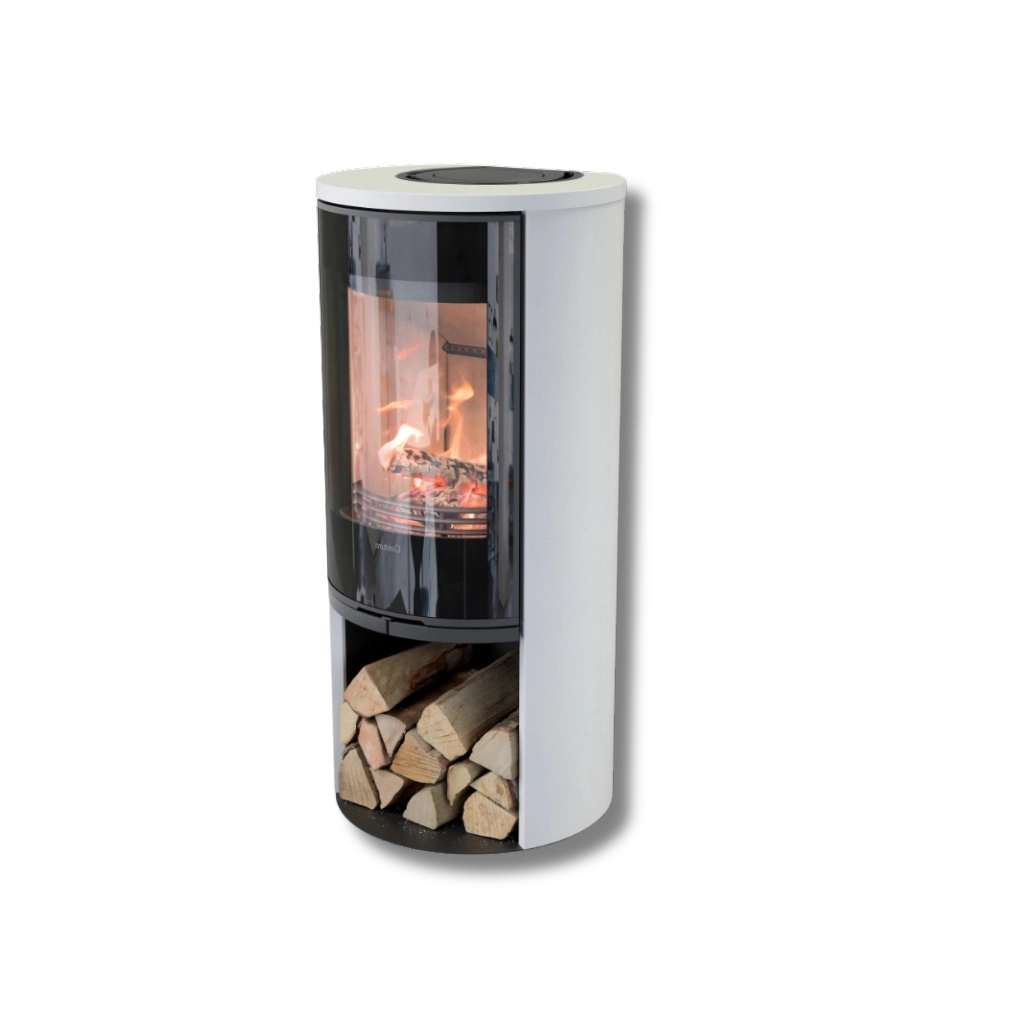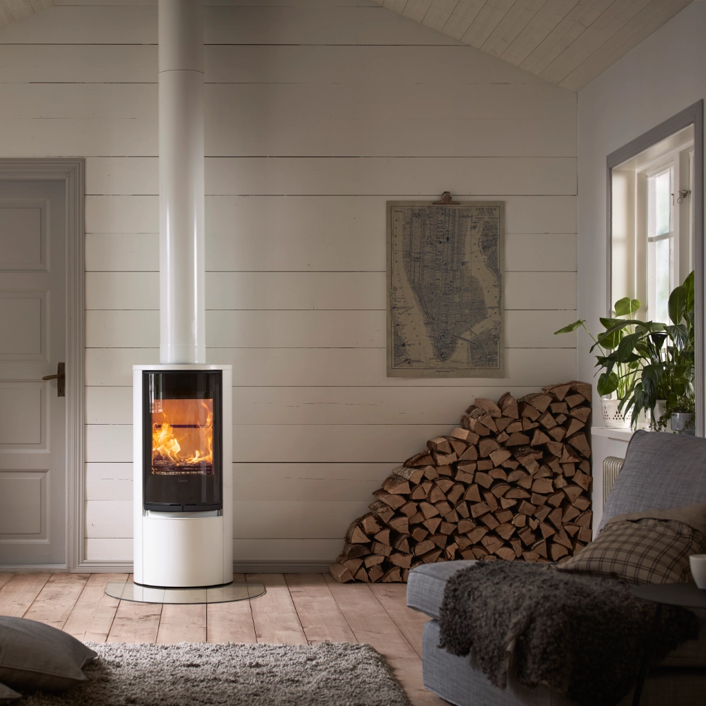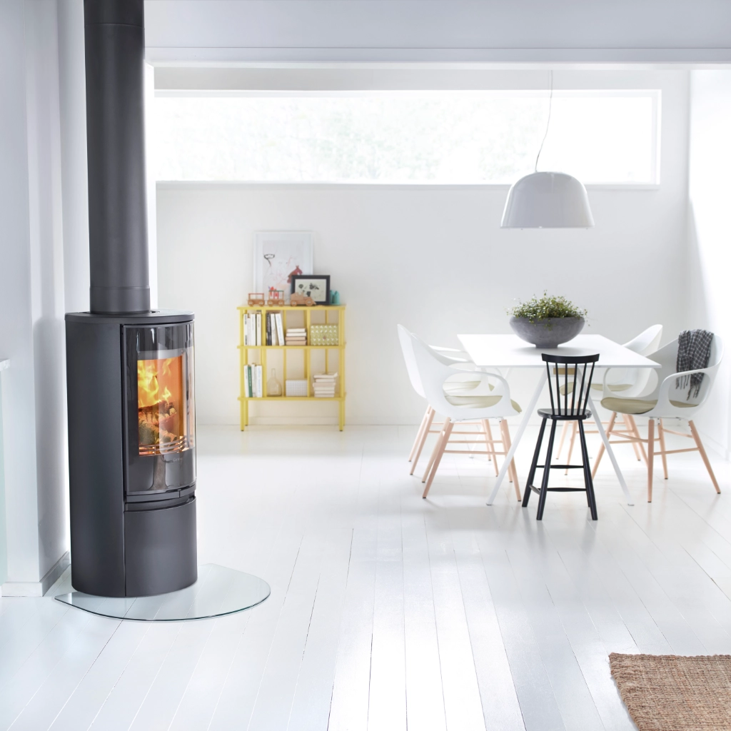 Tack vare den stora glasluckan sprider sig både värme och stämningsfullt ljus i rummet. Den moderna designen passar lika bra i det nybyggda huset som i stugan på landet. Kaminen är lätt att placera och ger effektiv värme även i mindre utrymmen.