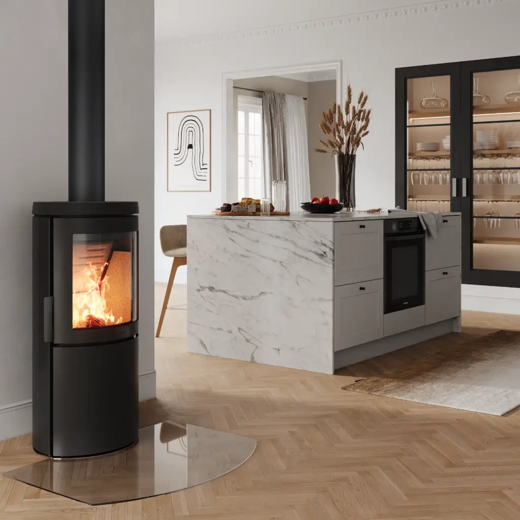 Låt dig tjusas av de dansande lågorna i Hwams nya braskamin Hwam 3120. Luckans välvda glasruta gör att du kan njuta av eldslågorna från många vinklar i rummet.