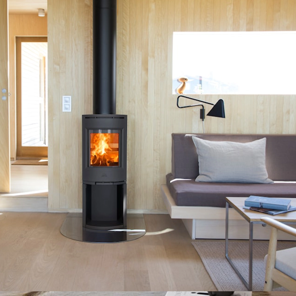 Designen i svart matt lack ger ett elegant och tidlöst uttryck, utvecklat av den prisbelönta norska designbyrån Hareide Design. Du kan välja mellan modeller med sockel eller pelare, samt med eller utan sidoglas för att passa just ditt hem och din stil.