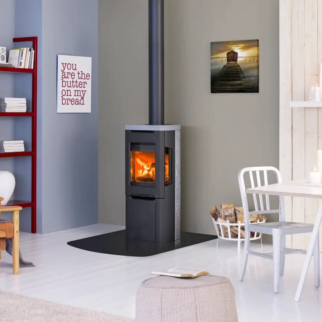 Med stora sidoglas får du en fantastisk vy av lågorna från flera håll i rummet, och de integrerade panelerna av naturlig täljsten lagrar värme medan elden brinner. När elden slocknat frigör täljstenen värmen långsamt, vilket skapar en behaglig och varaktig eftervärme.