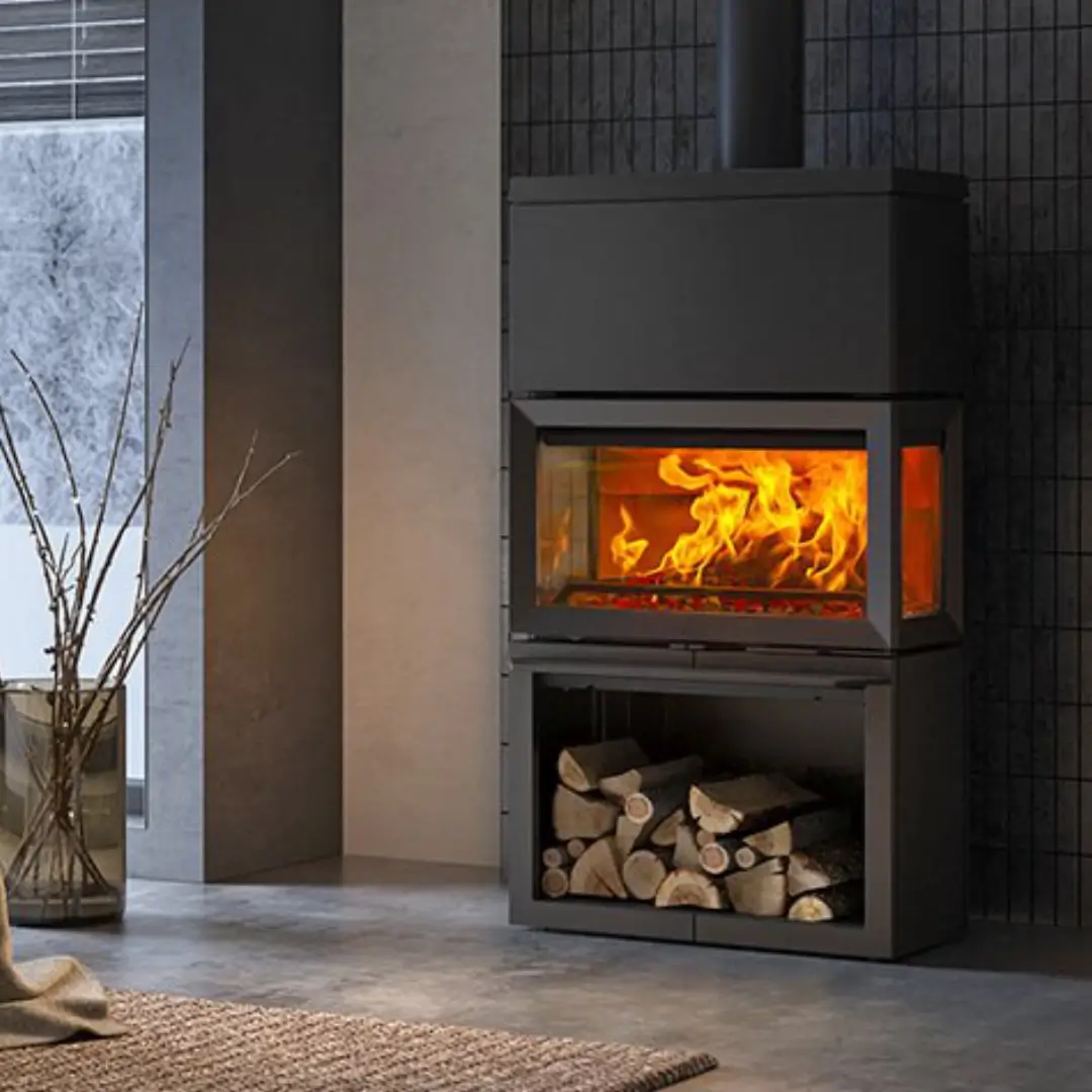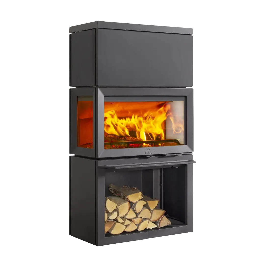 I sockeln finns ett praktiskt vedfack som ger smart och lättillgänglig förvaring av ved. De stora glaspartierna, med effektiv ytbehandling och luftspolningssystem, håller rutorna renare och ger en tydlig och vacker insyn till lågorna. Den ljusa eldstadsbeklädnaden i massivt gjutjärn skapar dessutom en stämningsfull flambild.