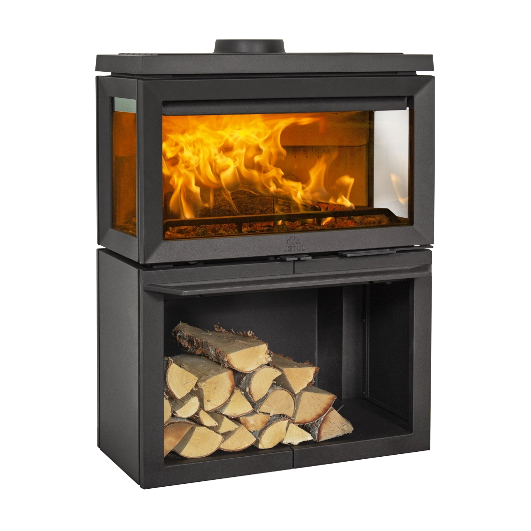 I sockeln finns ett praktiskt utrymme för vedförvaring, vilket gör det enkelt att ha bränsle nära till hands. För ökad säkerhet är kaminen utrustad med brasbegränsare i brännkammaren och snäpplås i luckan.