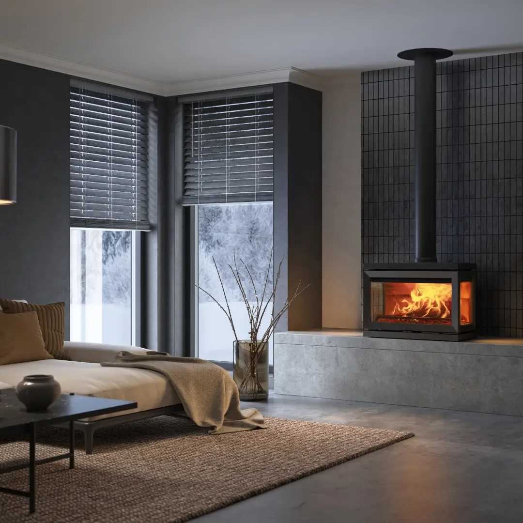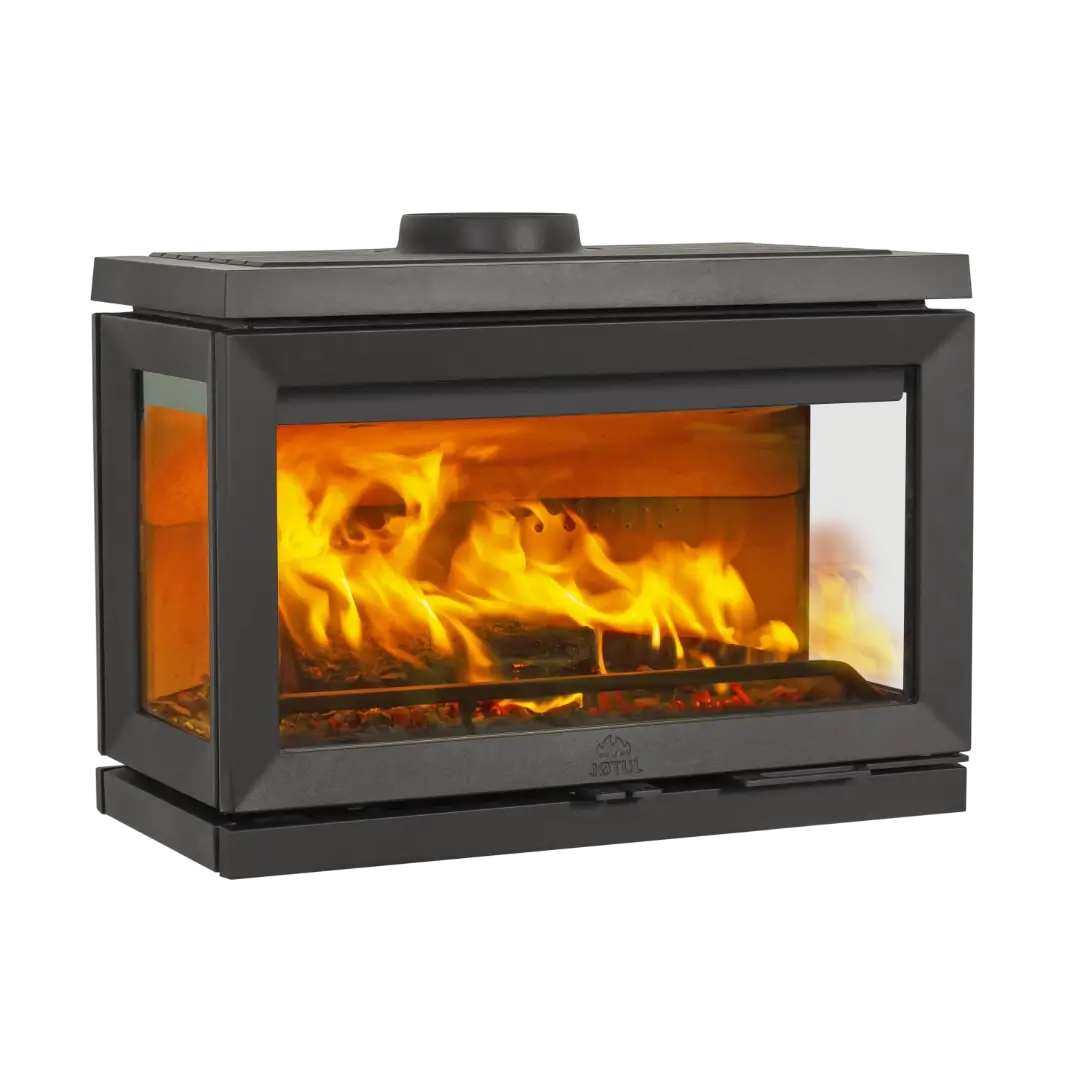 Kaminen kan placeras på ett underlag anpassat efter både tekniska krav och din inredningsstil, vilket gör den flexibel att integrera i hemmet. Tre stora glaspartier och ljus eldstadsbeklädnad ger en imponerande och luftig insyn till lågorna från flera vinklar i rummet. Glasen är behandlade för att hålla sig renare längre och luftspolningsfunktionen bidrar till klar sikt.