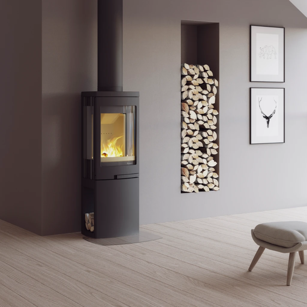Tack vare den dolda tilluftskanalen blir installationen enkel och smidig, samtidigt som kaminen bibehåller sin eleganta form. Duo 2 DV är särskilt lämplig i välisolerade och energieffektiva hem, där kontrollerad tillförsel av förbränningsluft är viktig.