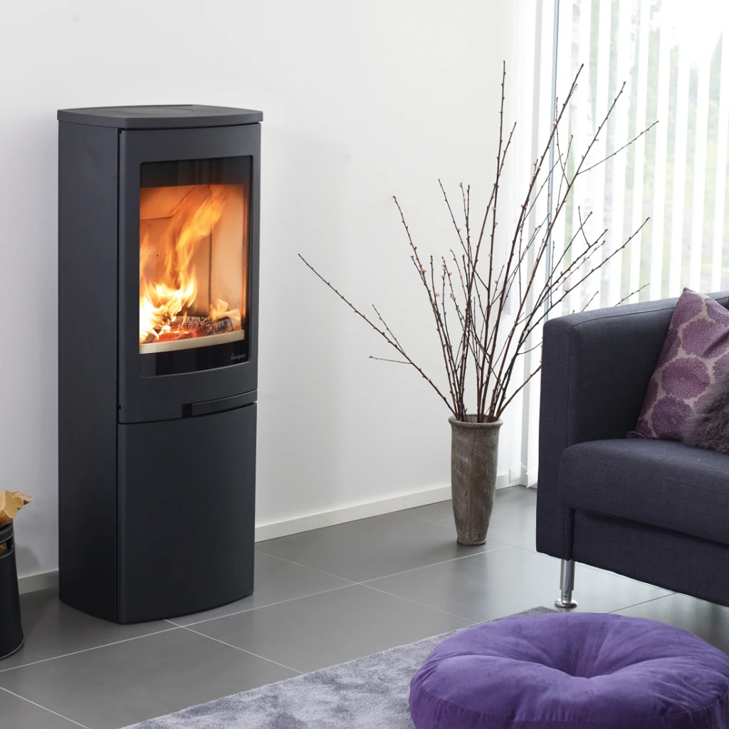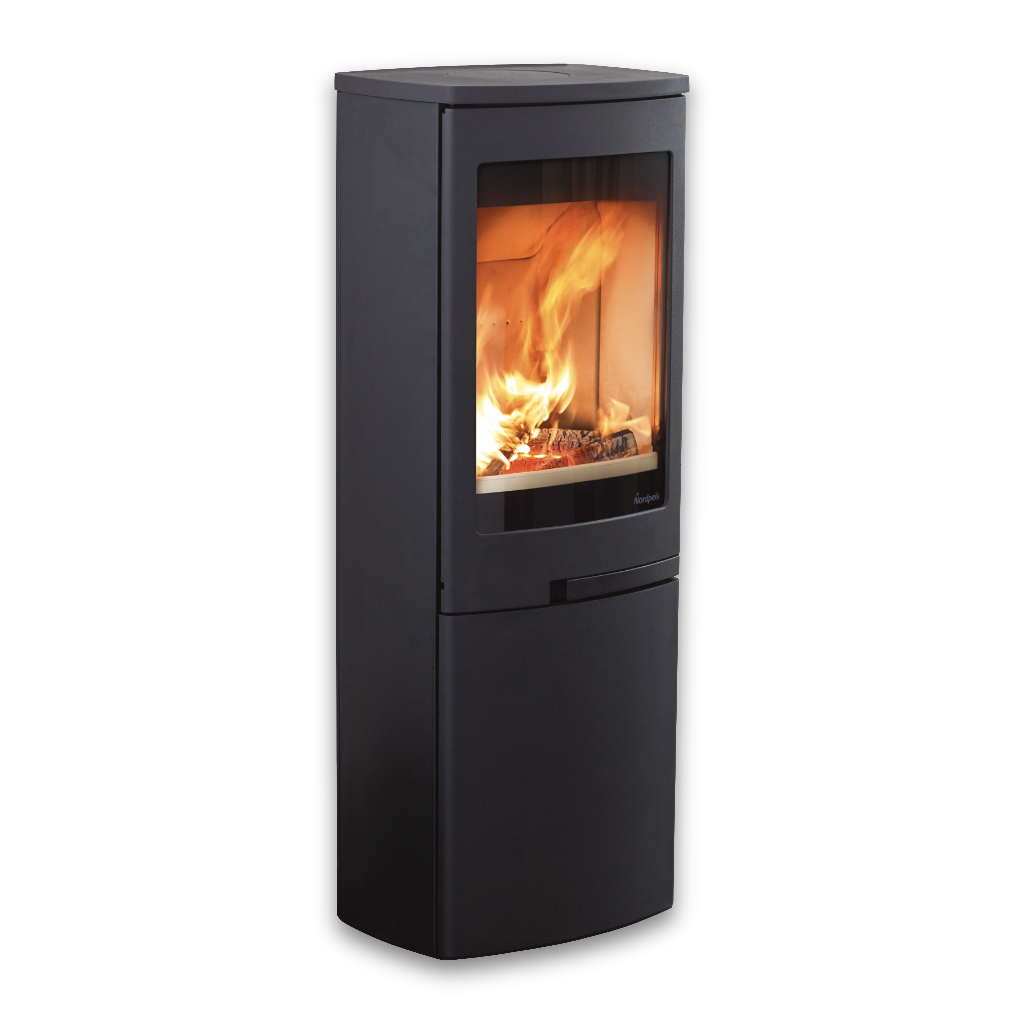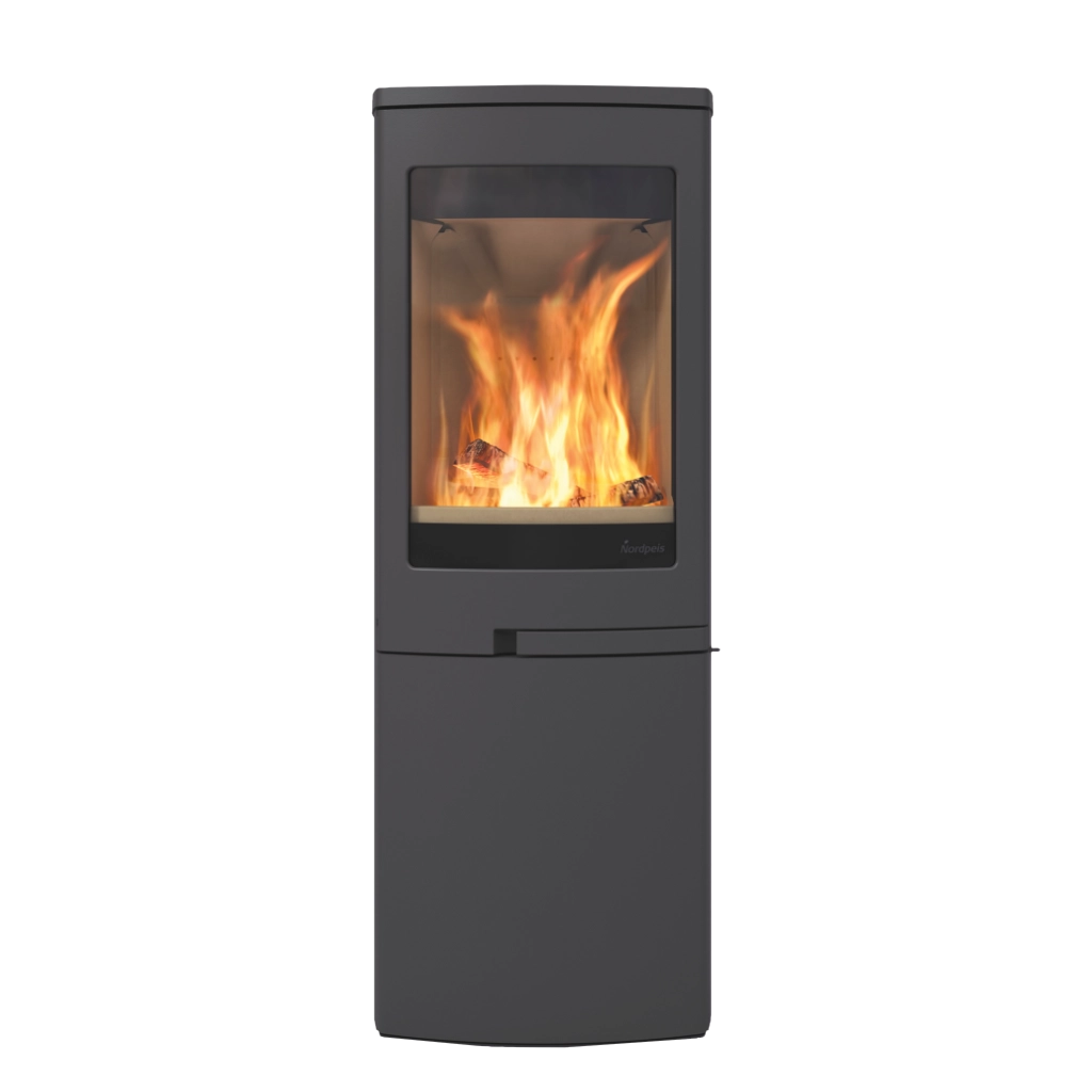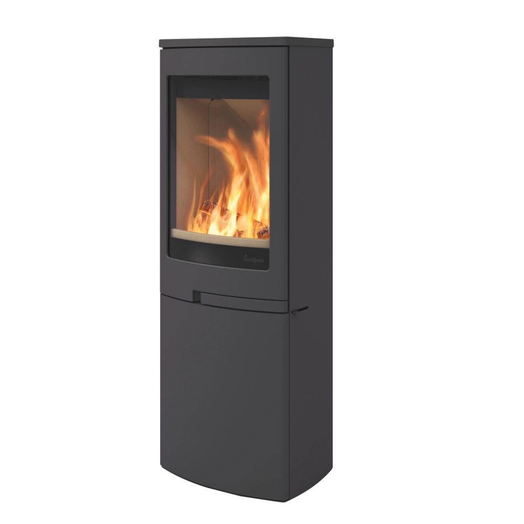 Duo 5 från Nordpeis är en elegant och funktionell kamin med stor glaslucka som bjuder på en generös insyn till lågorna. Den stilrena underdelen med lucka döljer praktisk förvaring för ved eller tillbehör – perfekt för dig som vill kombinera form och funktion.