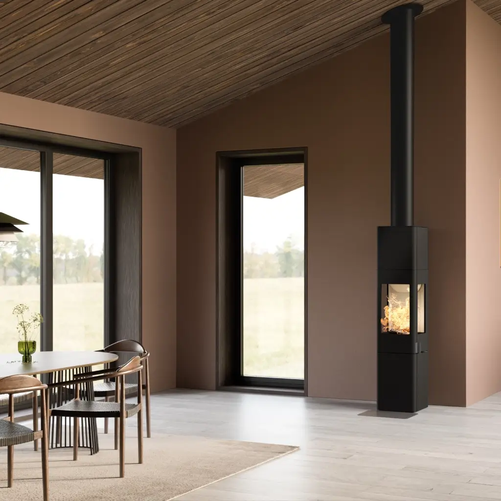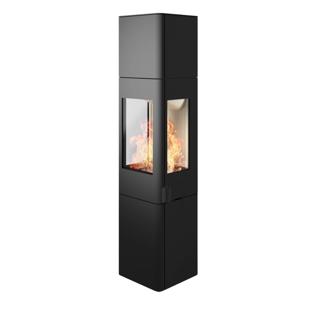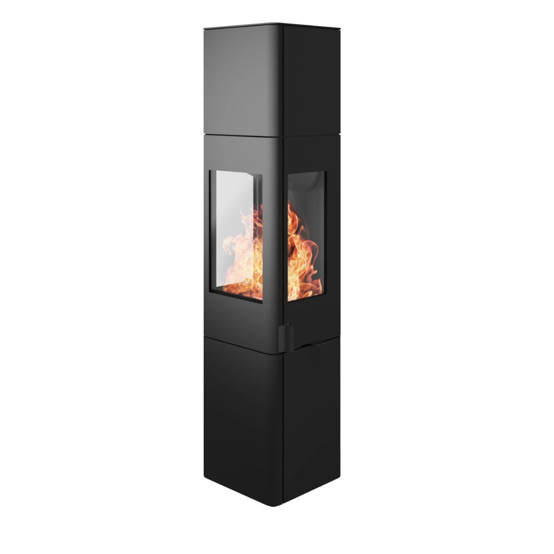 Den höga brännkammaren är omgiven av stora glasytor som ger fri sikt till lågorna från flera vinklar. Med sina rena linjer, rundade kanter och smäckra stålkonstruktion är YoU Steel High ett riktigt statement i rummet – utan att ta onödig plats.