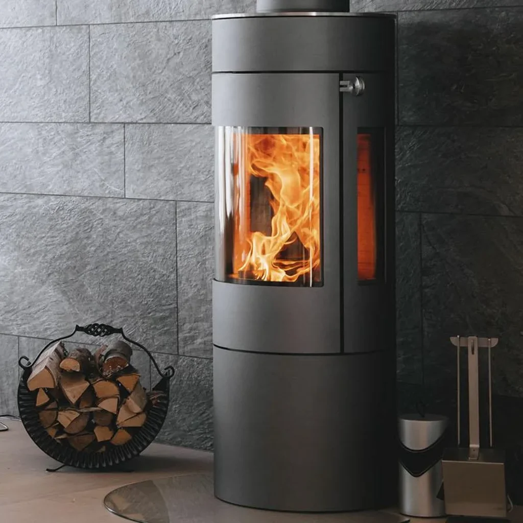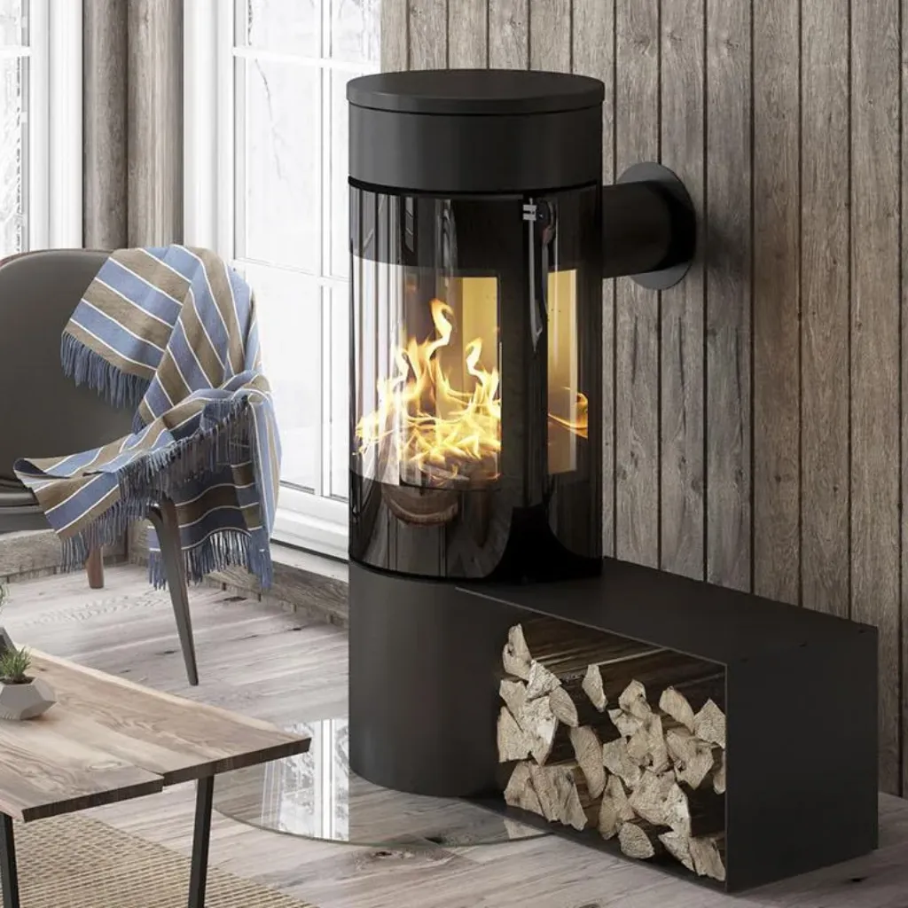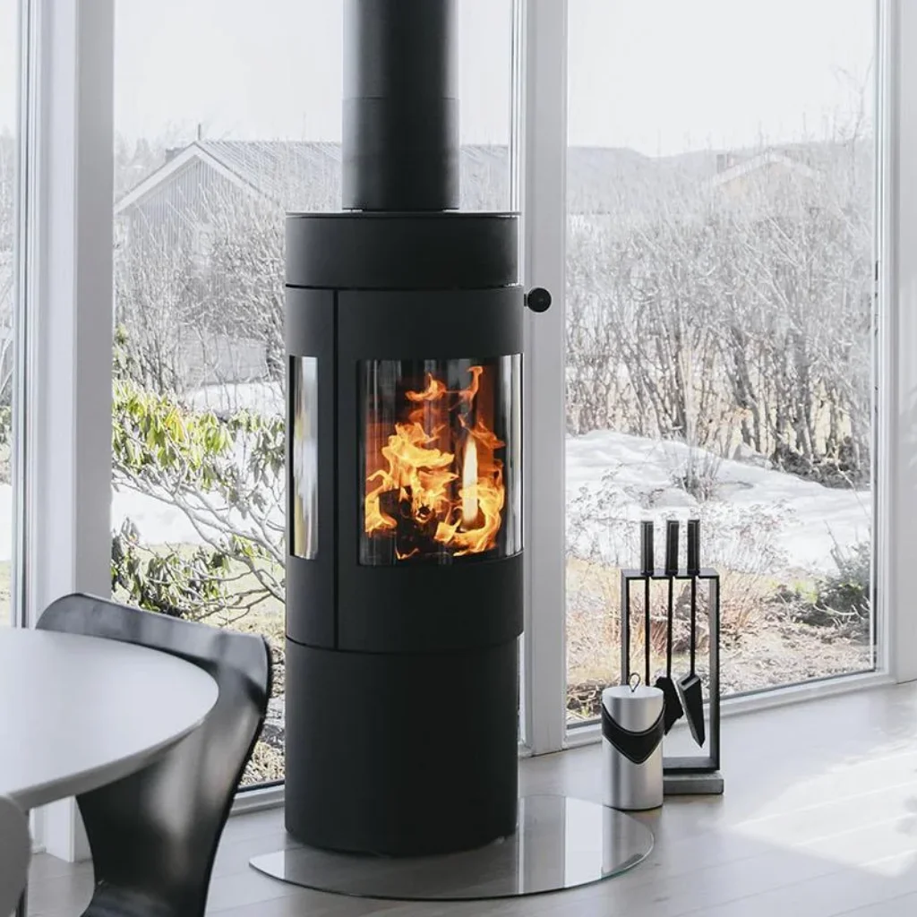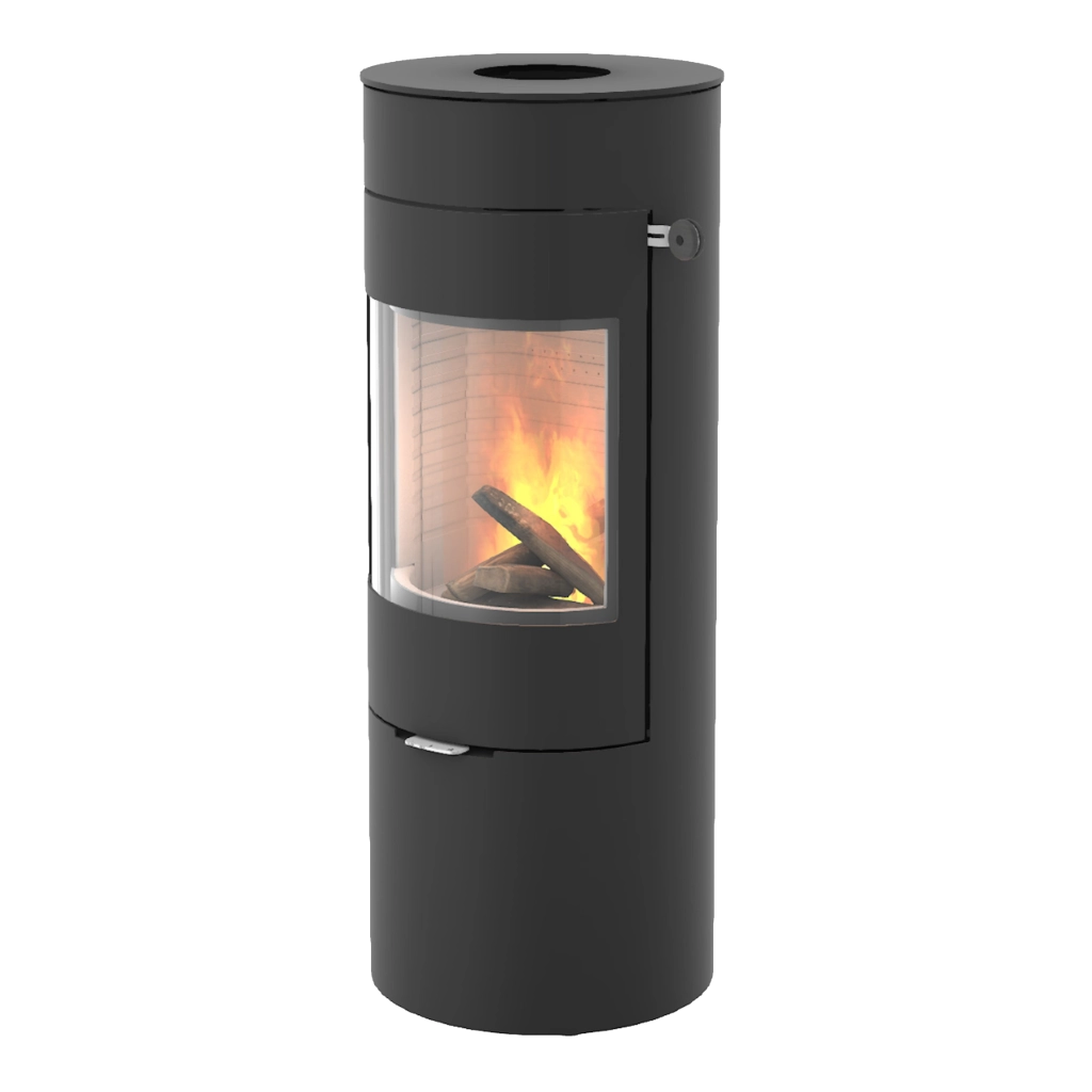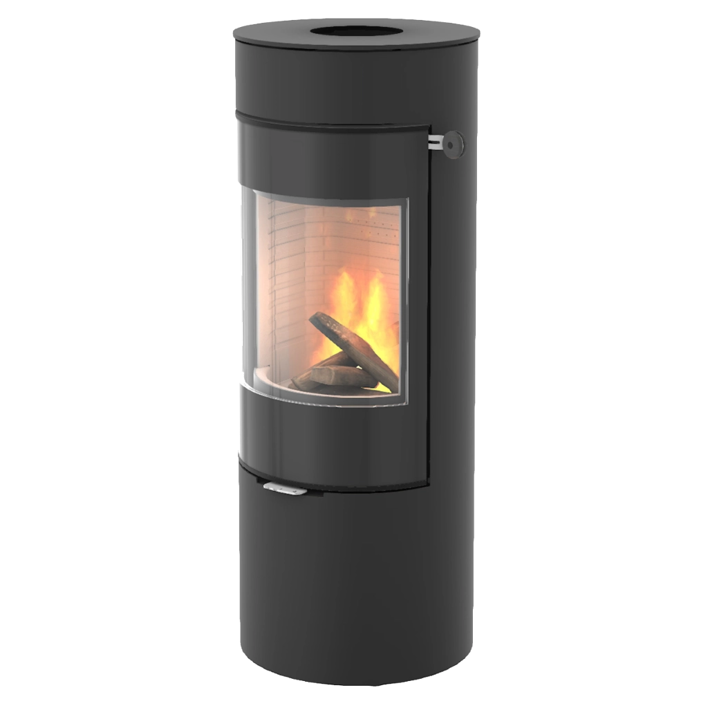Den välvda glasluckan och de strama linjerna ger kaminen ett harmoniskt och modernt uttryck. Det diskreta handtaget smälter in i designen, och den stora glasrutan ger fri sikt till lågorna – så att du kan njuta av brasan från flera vinklar i rummet.
