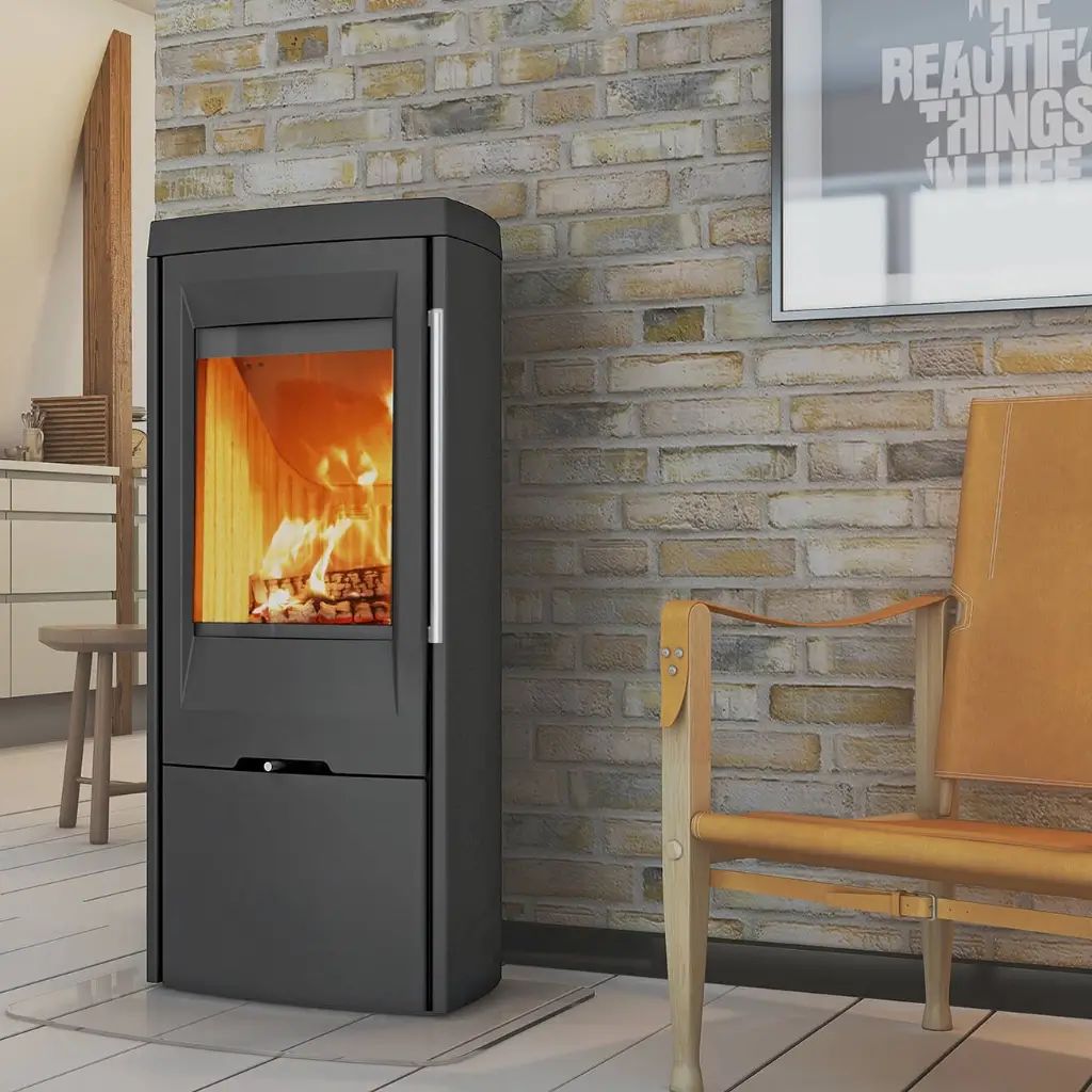 Både dörr, topp och brännkammare är tillverkade i gjutjärn, vilket ger kaminen en kraftfull och gedigen känsla. Trots sin solida konstruktion har modellen en slank och smäcker siluett, vilket gör att den upplevs lätt i rummet och passar lika bra i små utrymmen som i öppna planlösningar.