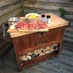 Vagnen har låsbara hjul för enkel förflyttning och stabilitet. Den levereras med en 5 cm tjock, handgjord skärbräda i ek (100×57 cm, ca 13 kg), perfekt för förberedelser och servering. Tillverkad i samma cortenstål som Glödgrillen, väger Glödvagnen totalt ca 110 kg och blir en naturlig förlängning av din grillstation.