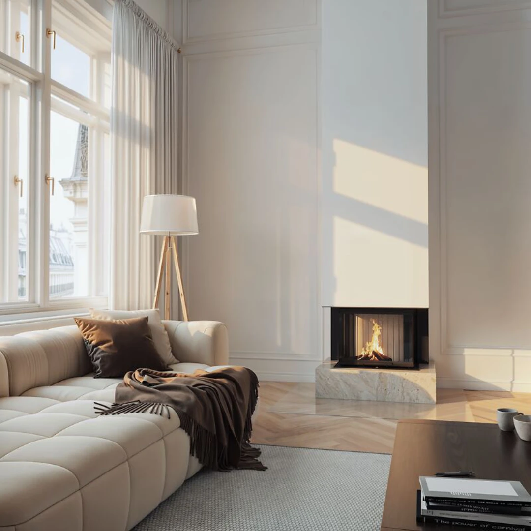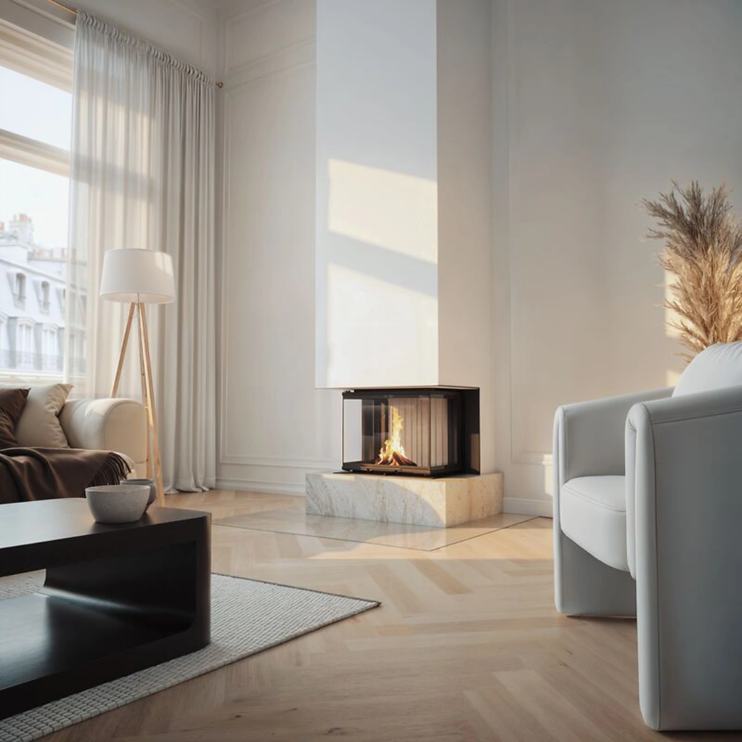 Insatsen kan byggas in på flera sätt för att matcha din stil. Välj en bred monteringsram i svart stål (FT – Fire Table) för en markerad inramning, eller en smalare installationskant för ett mer diskret och minimalistiskt uttryck. För extra värmelagring finns även det smarta MAS-värmemagasinet som tillval, vilket ger längre och jämnare värme i rummet.