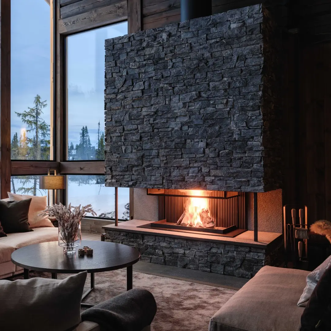 Urfeuer Panorama är designad för att placera elden i centrum, bokstavligt talat. Den öppna konstruktionen utan glas ger en genuin och ofiltrerad eldupplevelse, som skapar både värme och visuell närvaro i rummet – oavsett om du placerar eldstaden mitt i ett öppet planerat vardagsrum eller som rumsavdelare.