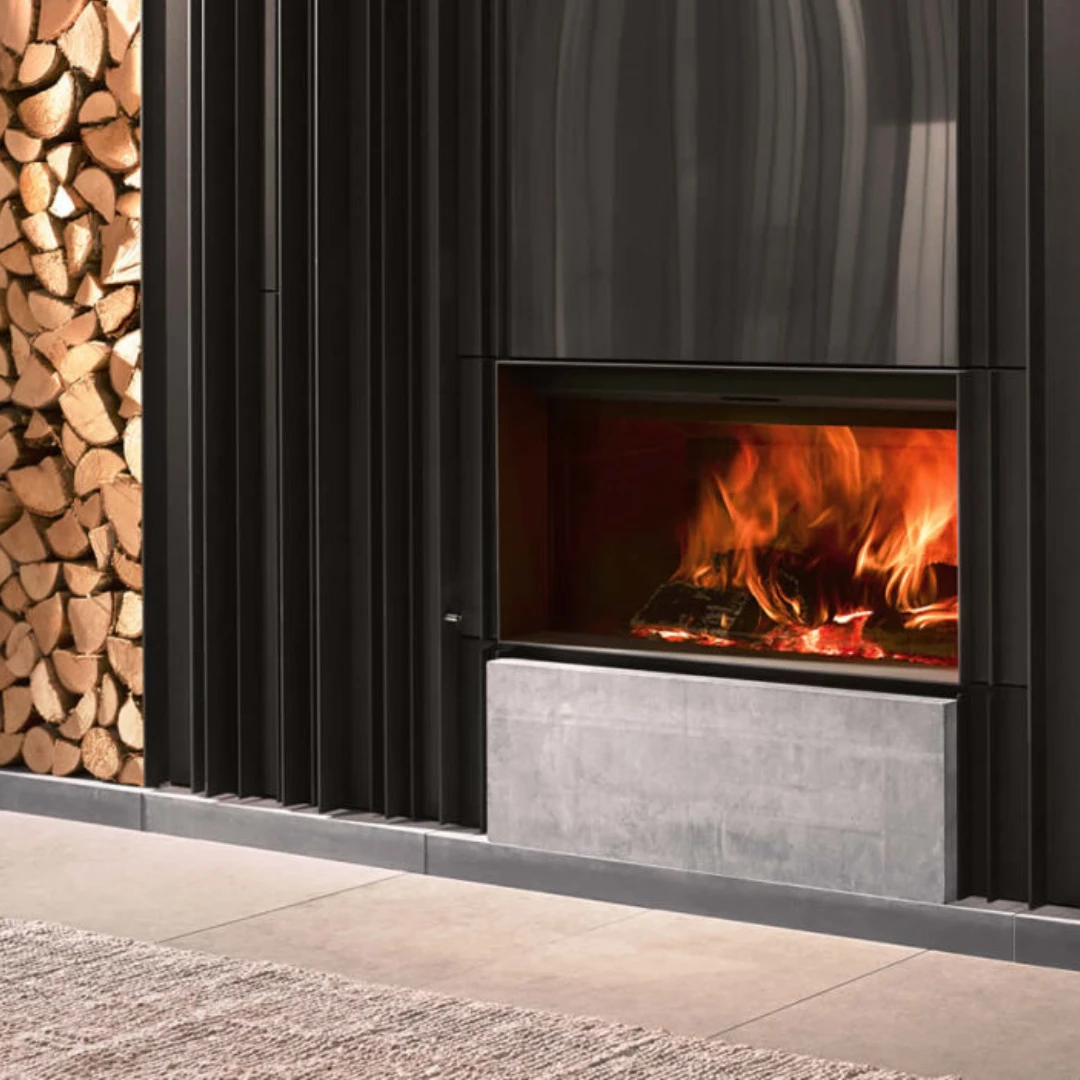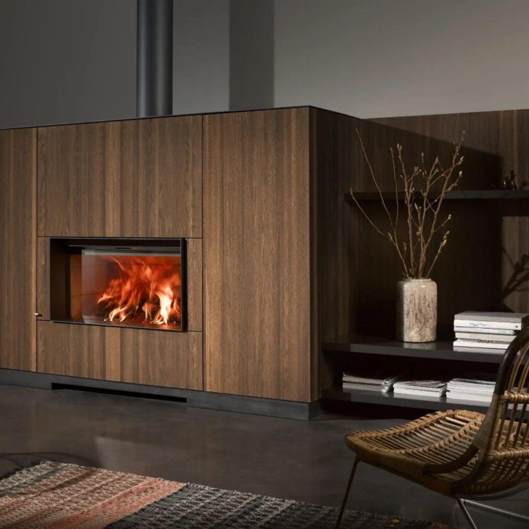 Tack vare Stûvs patenterade teknik kan du klä eldstaden i material som sten, trä eller metall – helt nära elden – för en skräddarsydd finish som harmoniserar med övrig inredning. Här kombineras maximal designfrihet med hög verkningsgrad och effektiv värme.