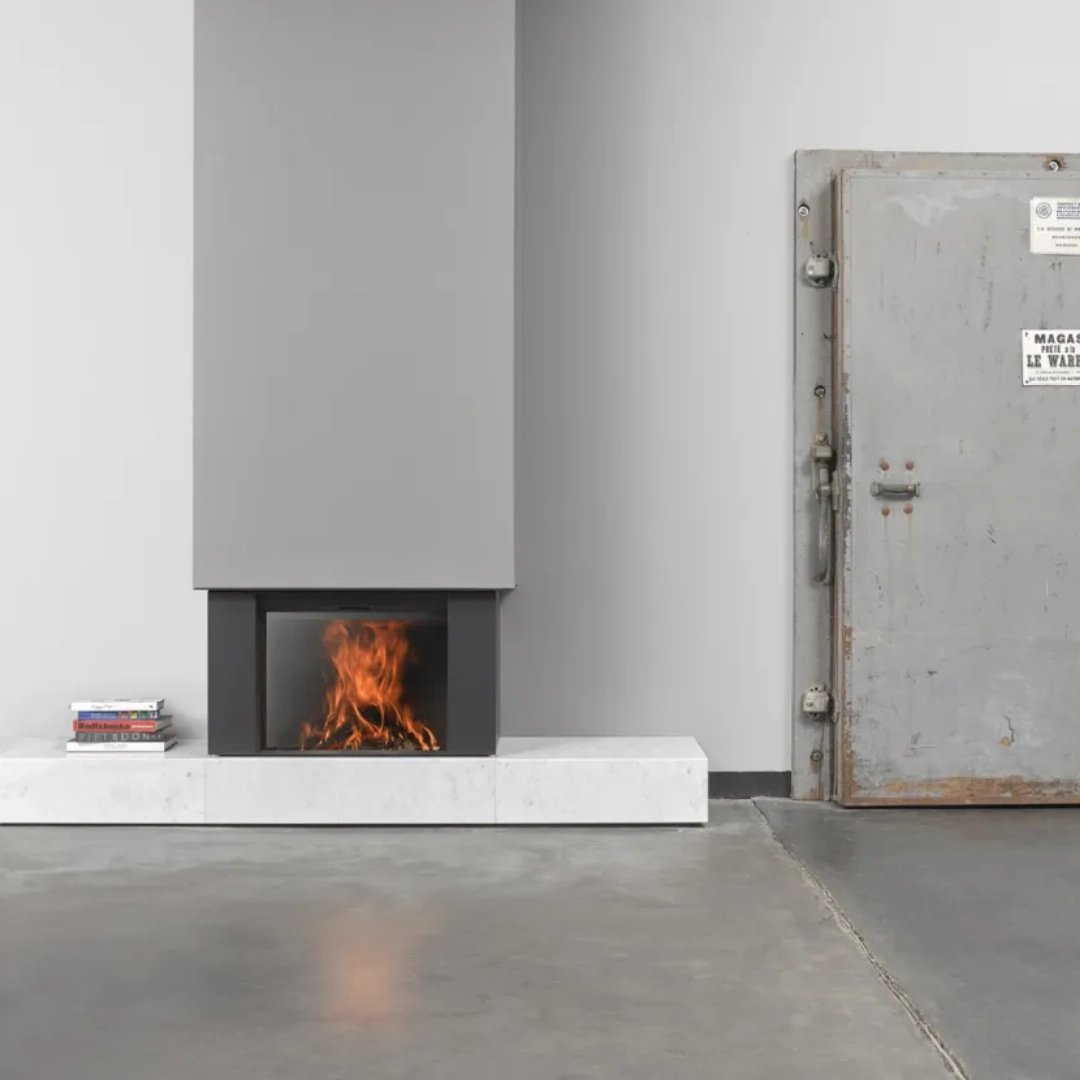 Stûv 22-90 förenar modern eldstadsdesign med kompromisslös prestanda. Tack vare en nästan ramlös front och en patenterad teknik kan du klä spisen med valfritt material – trä, sten eller stål – ända fram till öppningen. Det gör elden till en naturlig och harmonisk del av rummets helhet.