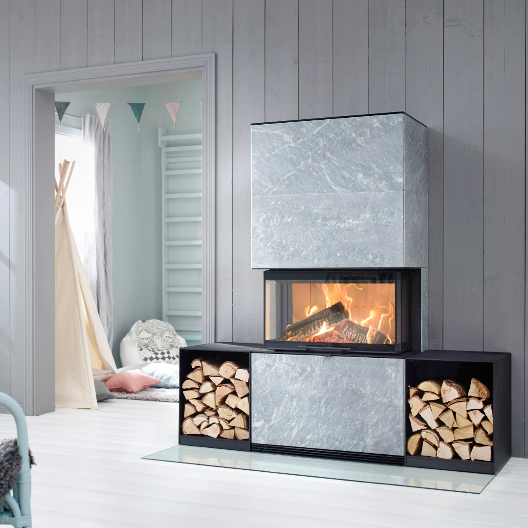 De generösa glasytorna på tre sidor ger en fantastisk eldsynlighet och skapar en varm atmosfär i hela rummet. För dig som vill förlänga värmen ytterligare efter att lågorna slocknat, finns möjligheten att välja till värmelagrande Powerstone som döljs under höljet.