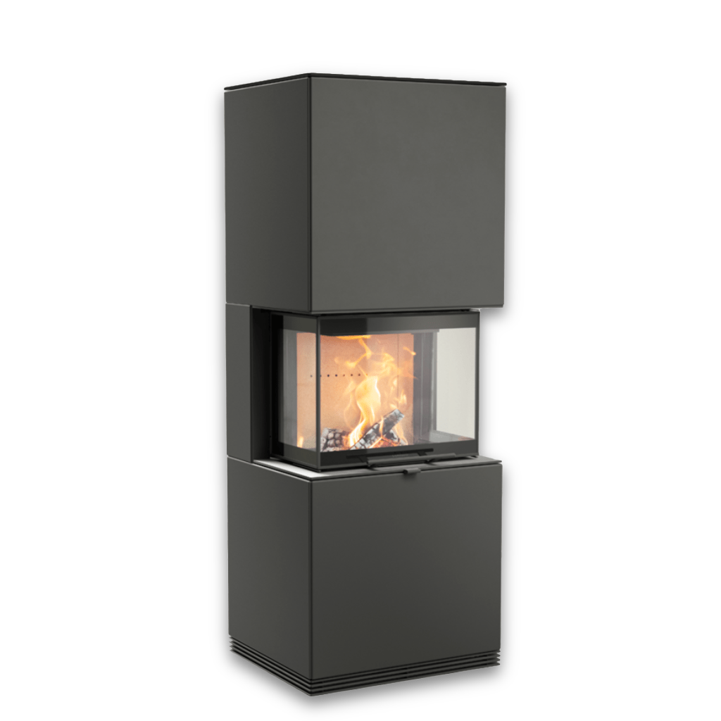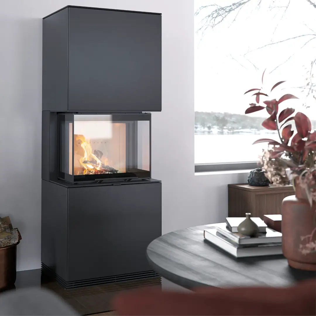 I svart plåt blir eldstaden ett kraftfullt blickfång, där kontrasten mellan den mörka ytan och lågornas varma sken skapar en dramatiskt elegant atmosfär. Perfekt för dig som söker en modern kamin med stark karaktär.