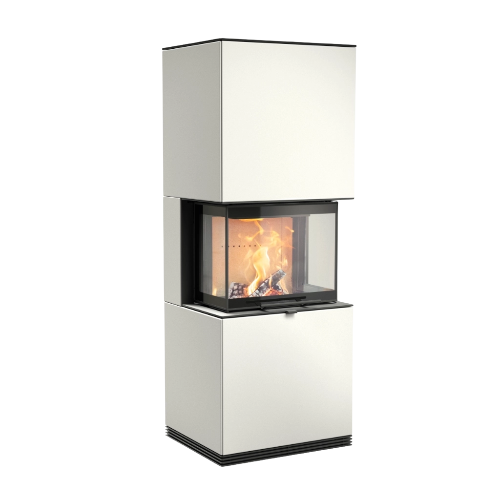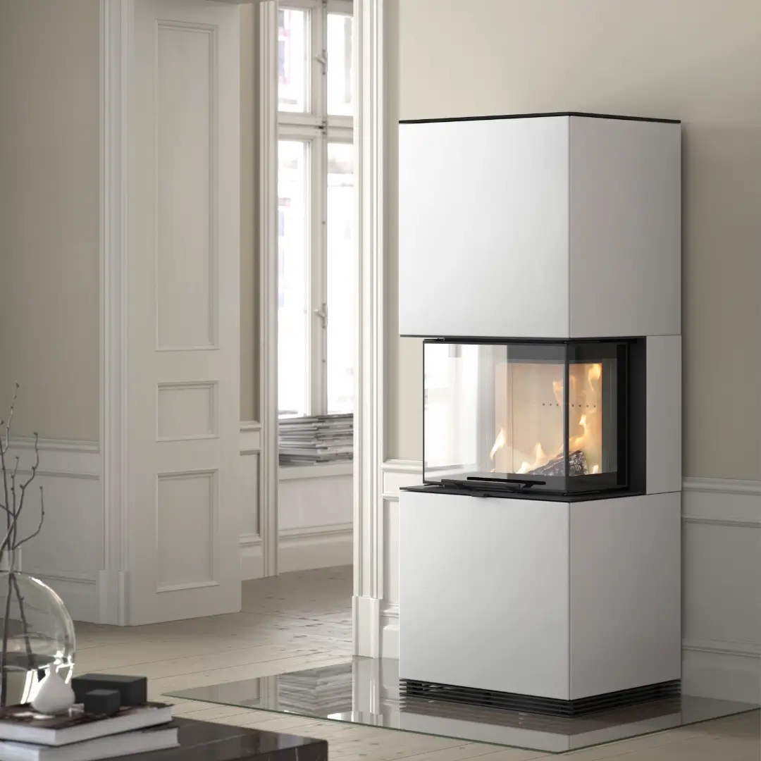 I vit plåt får eldstaden ett mer diskret och skandinaviskt uttryck. Den ljusa färgen smälter smidigt in i rummet och bidrar till en luftig, harmonisk känsla, samtidigt som brasan syns tydligt genom det stora glaspartiet.