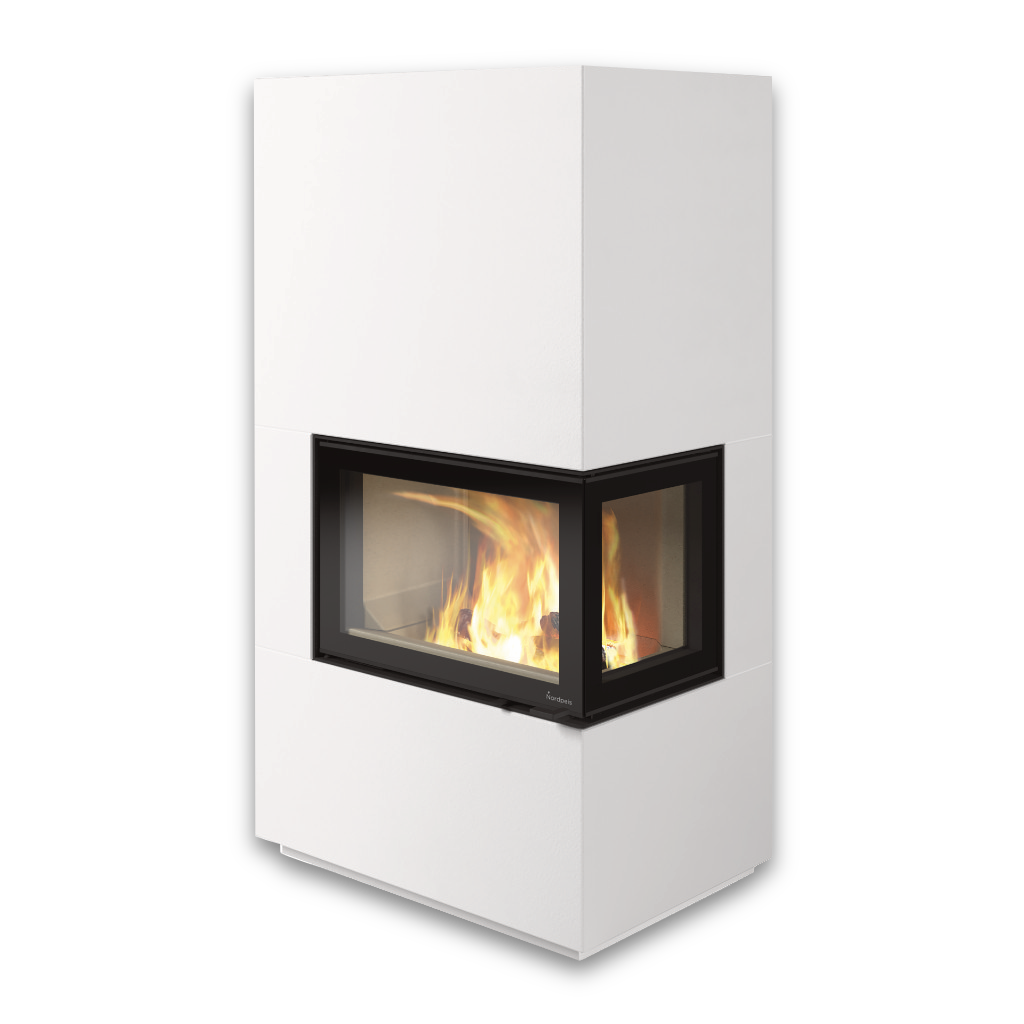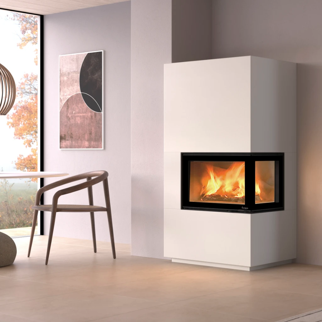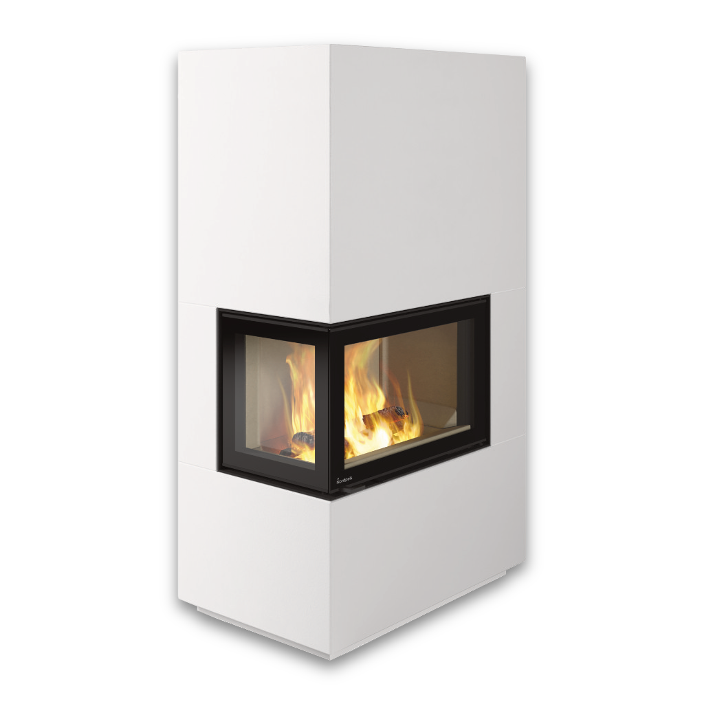 Den avancerade eldstadsinsatsen erbjuder generös insyn till lågorna från tre håll – genom dubbla glaspartier i front och sidor. De sidomonterade glasen är utrustade med en reflekterande ytbehandling som förbättrar värmeeffektiviteten och bidrar till att hålla rutorna renare.