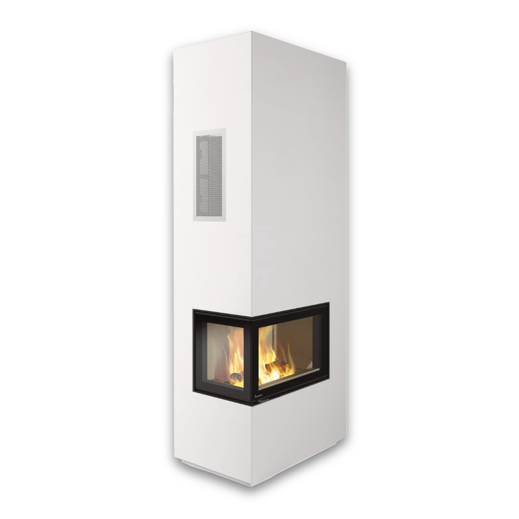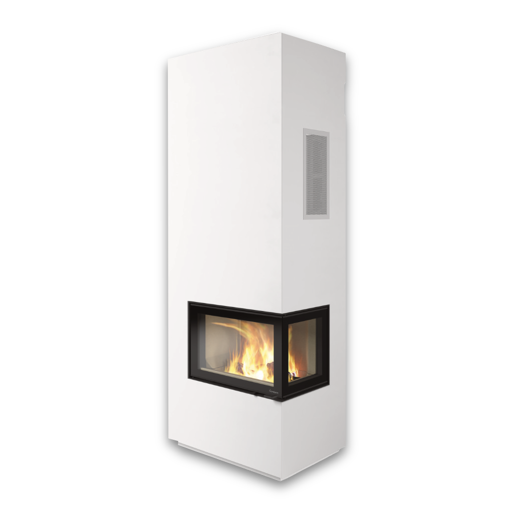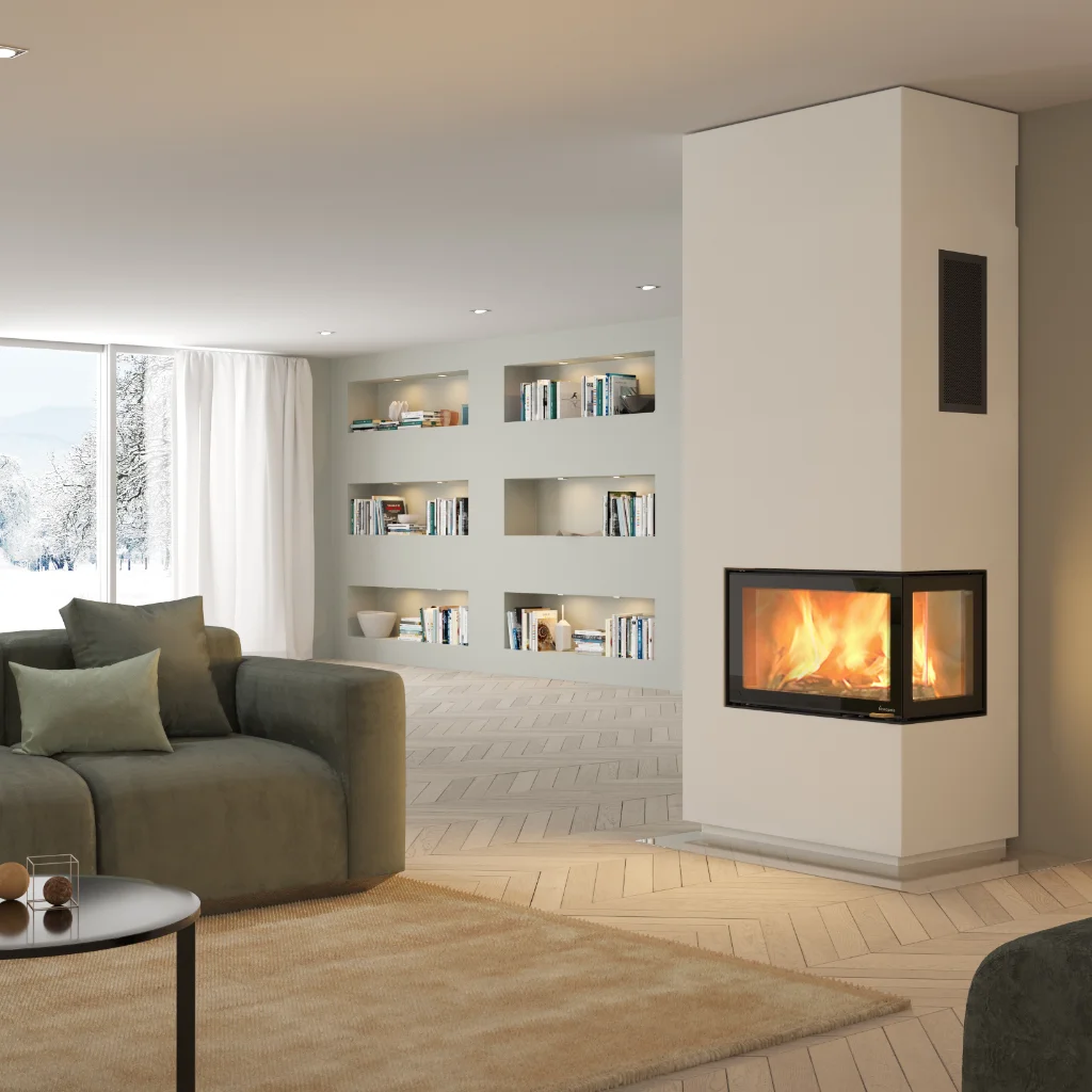 Den avancerade insatsen har dubbla glas både i fronten och på sidorna, vilket skapar en fantastisk panoramavy över lågorna. Sidoglasen är dessutom försedda med en reflekterande beläggning som förbättrar förbränningen och håller glasen renare längre – för en klar och levande flambild varje gång du eldar.