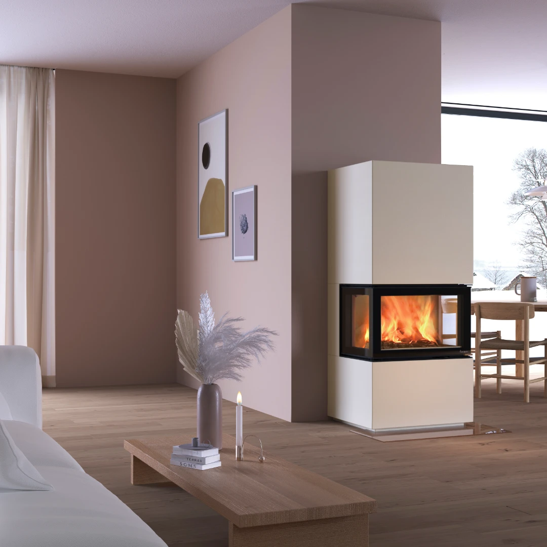 Brännkammaren är försedd med dubbla glas i front och på sidorna. Den avancerade konstruktionen med reflekterande beläggning på sidoglasen bidrar till att hålla glasen renare längre och ökar verkningsgraden – för en effektiv, ren och miljövänlig förbränning.