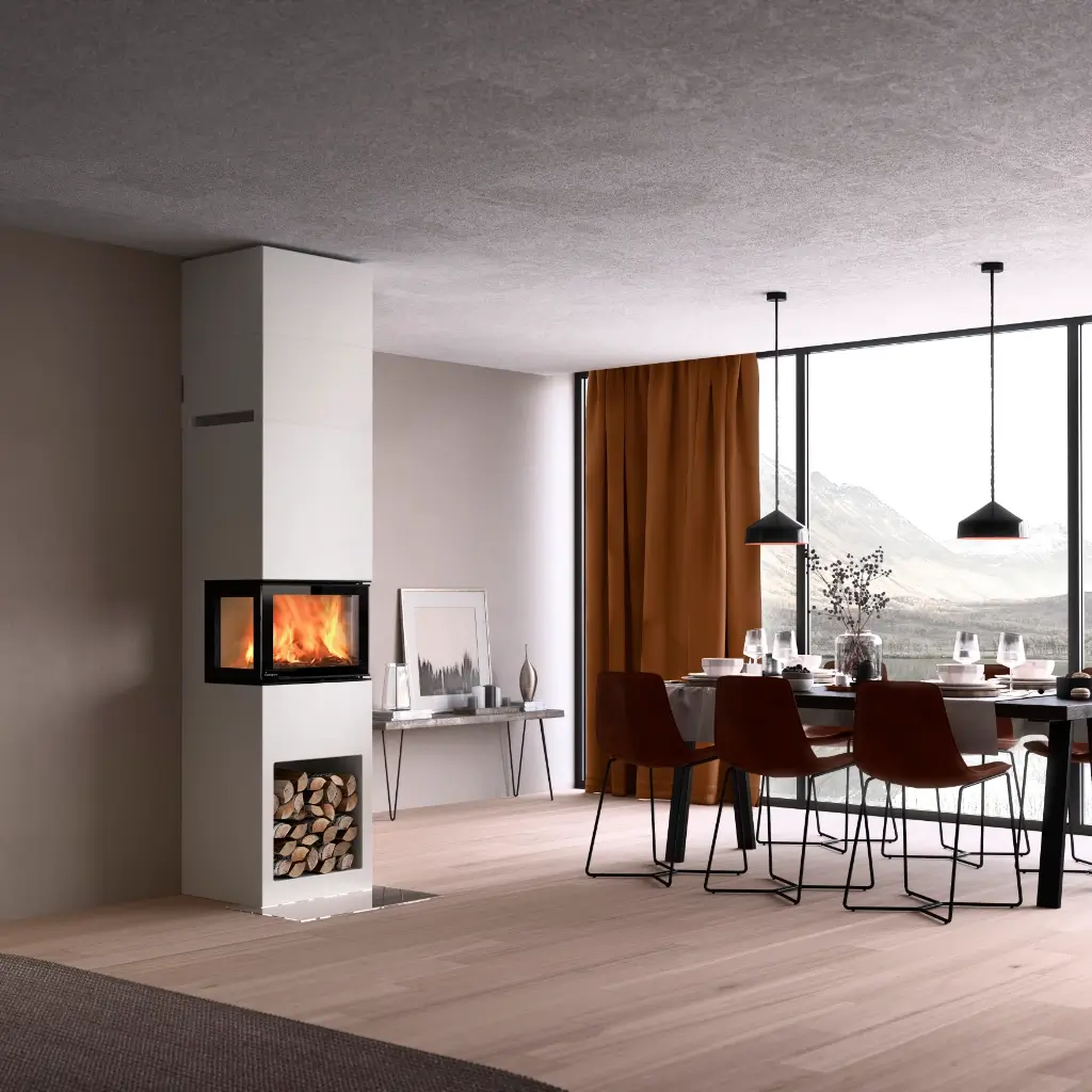 Nordpeis Praha passar dig som söker en modern murspis med panoramavy, praktisk förvaring och flexibla placeringsmöjligheter.