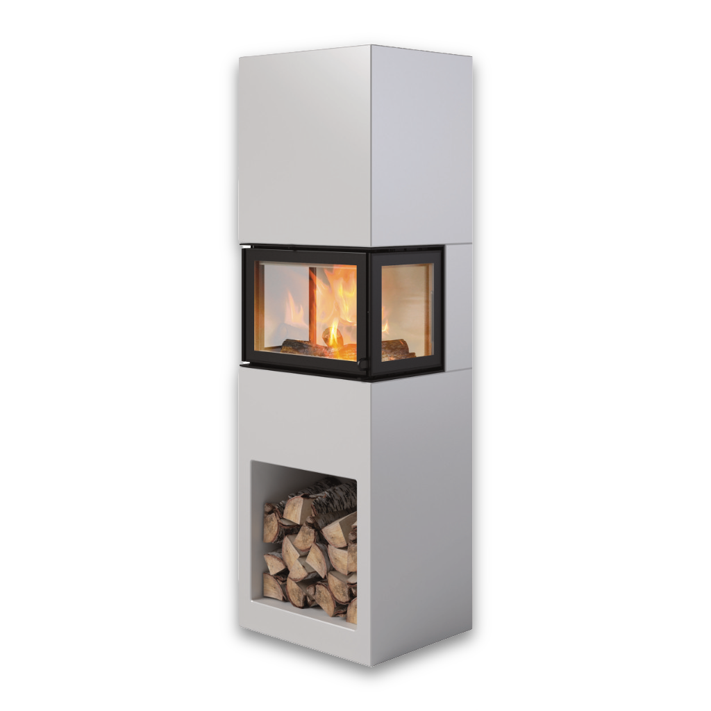 Tack vare en integrerad brandvägg kan Praha placeras direkt mot väggar av brännbart material, vilket gör installationen både säker och flexibel. För dig som vill ha en högre eldstad finns möjlighet att välja till extra toppelement och skapa en imponerande takhöjd.
