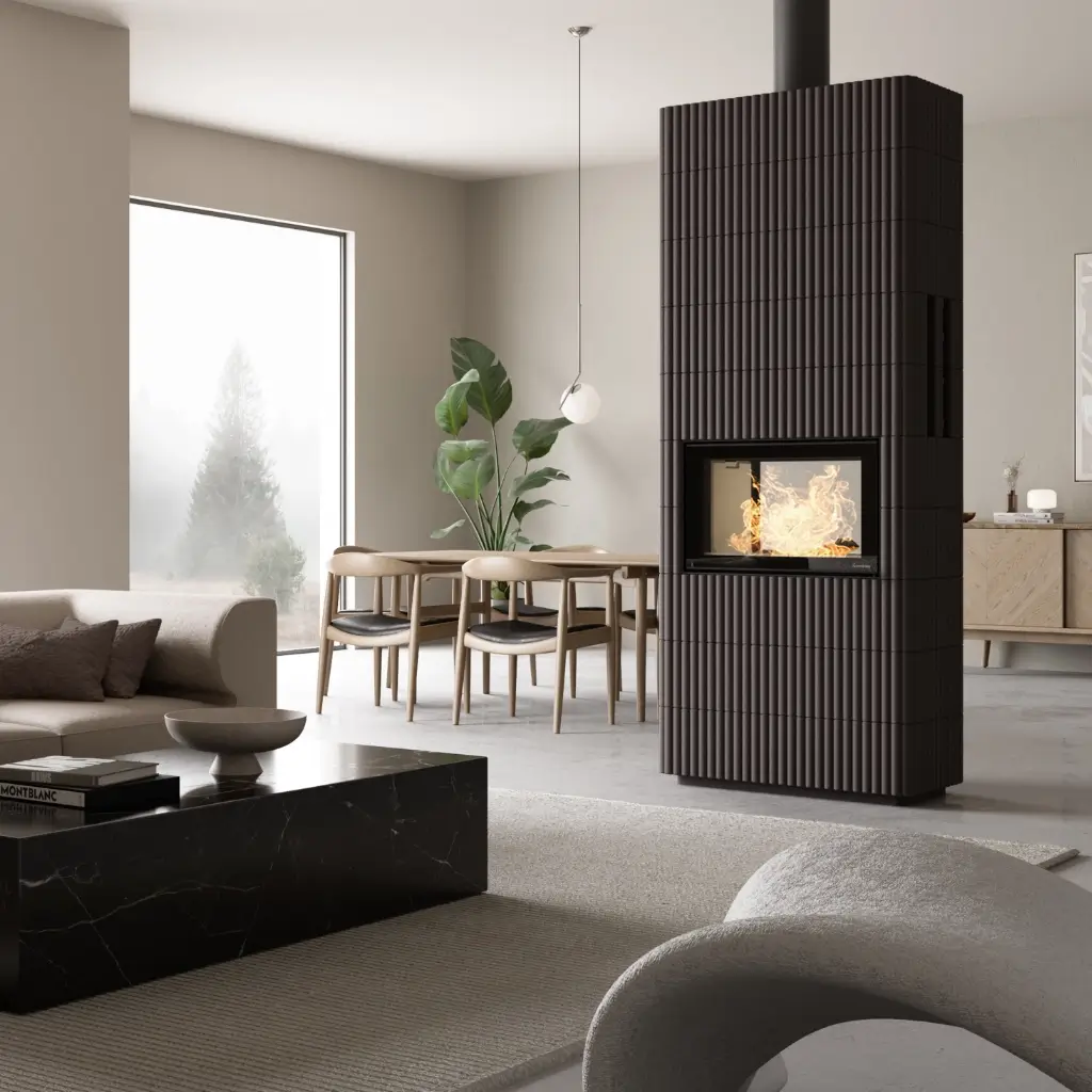 Nordpeis Wave T är en imponerande murspis med tunnelinsats – perfekt som rumsavdelare och stämningshöjare i öppna planlösningar. Med lågorna synliga från två håll skapar den ett naturligt blickfång och sprider en varm atmosfär genom hela rummet.