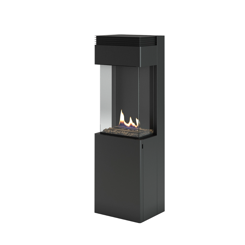 Kaminen är utrustad med BEV Technology®, där bioetanolen förångas och brinner som ånga, vilket gör att bränslet och lågorna aldrig har direktkontakt. Detta ger en snygg, säker och luktfri eld som du enkelt kontrollerar med ett knapptryck. Med den medföljande fjärrkontrollen kan du tända, släcka och justera lågorna i två effektlägen – hög eller Eco för längre brinntid.
