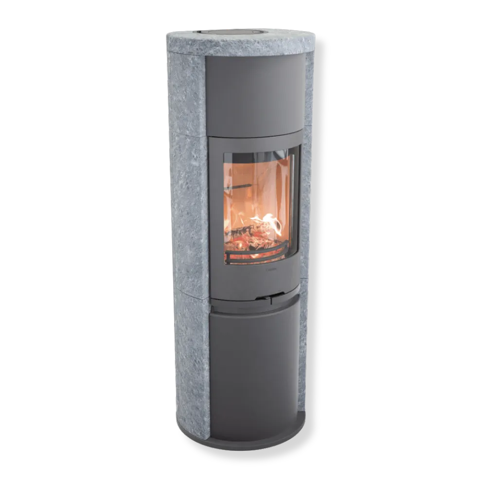 Kaminen är klädd i värmelagrande täljsten – ett naturmaterial med unika ådringar som gör varje modell helt unik i utseendet. Täljstenen lagrar värme under eldning och avger behaglig värme i flera timmar efter att elden har slocknat.