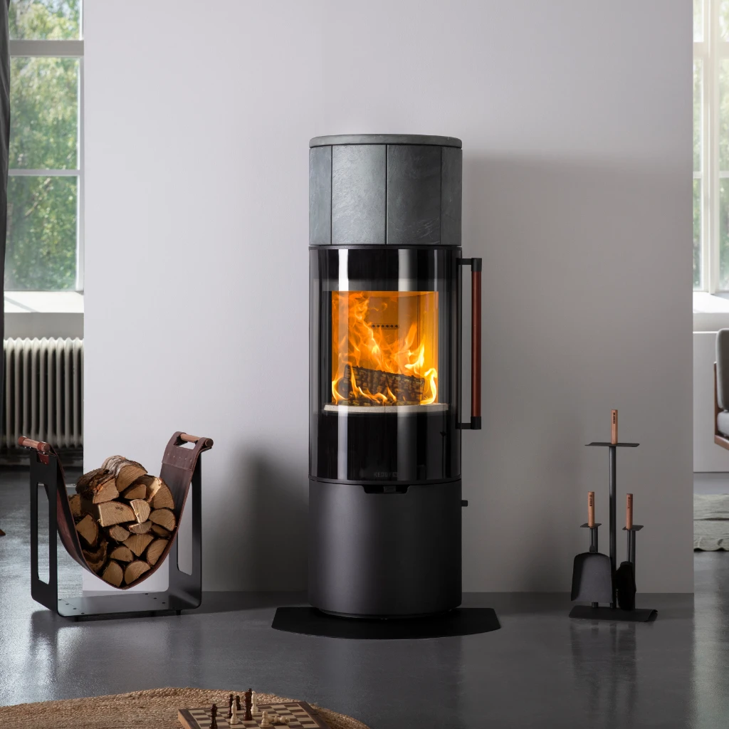 Med ett generöst panoramaglas får du fri insyn till lågornas sken – oavsett var i rummet du befinner dig. I standardutförande levereras kaminen med ett exklusivt handtag i svart läder, och du kan även välja till ett handtag i brunt läder för en mer personlig stil.