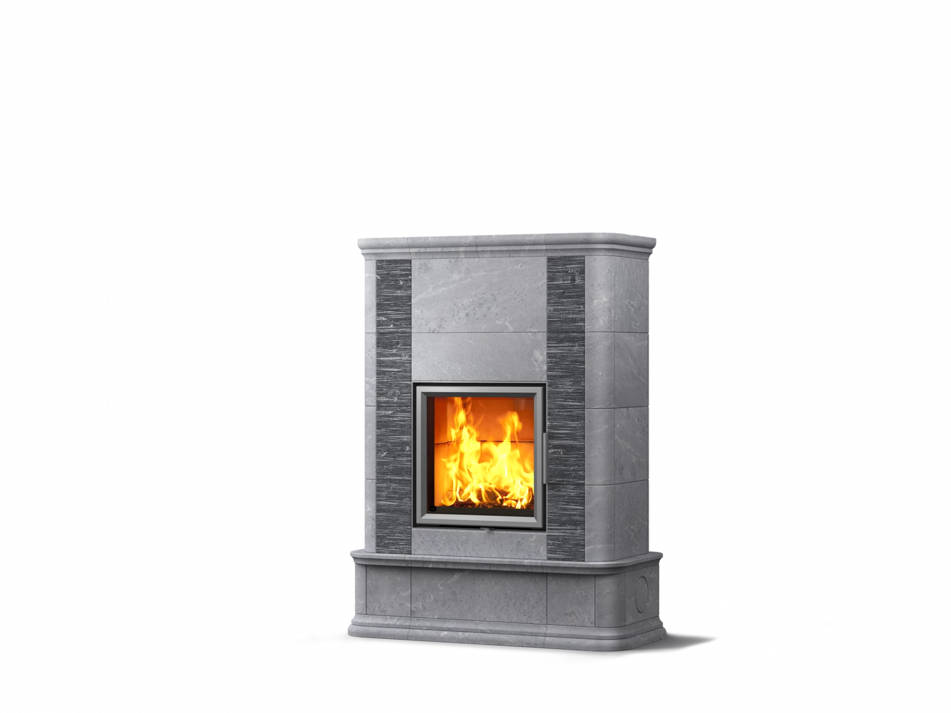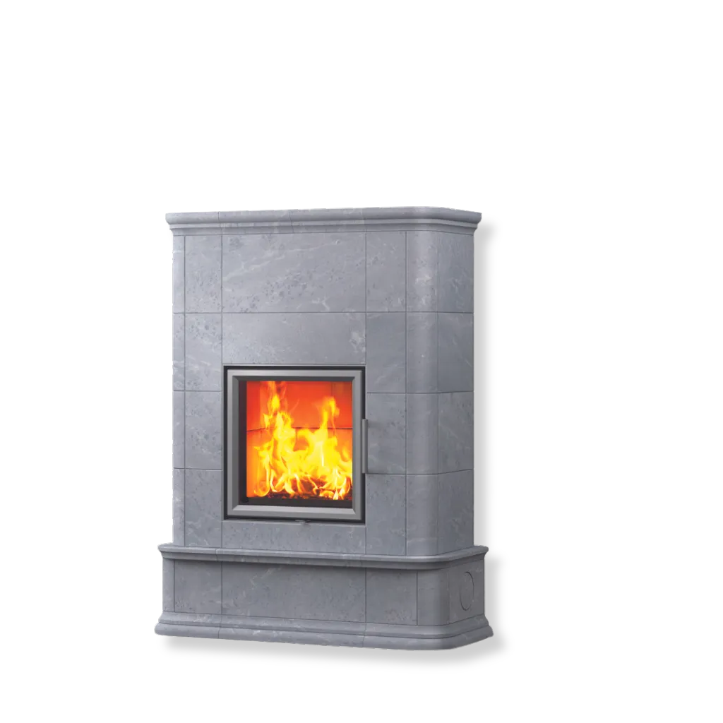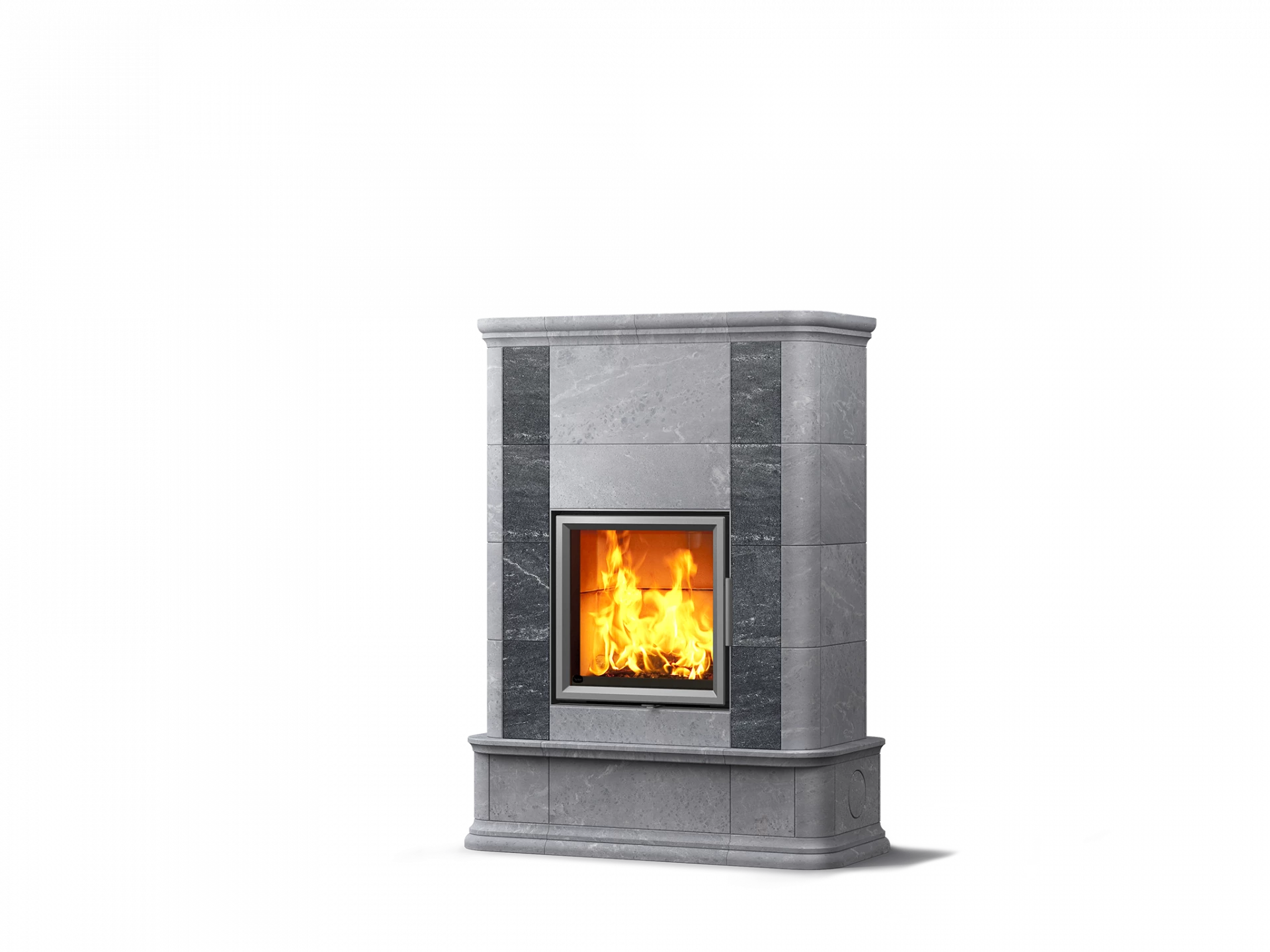 Kaminen är klädd i slät täljsten – helt eller delvis – och kan anpassas ytterligare med dekorplattor längs luckans sidor. Välj mellan ytor som den rustika Natural, mönstrade Grafia eller andra bearbetade ytor som lyfter fram eldstadens unika design.