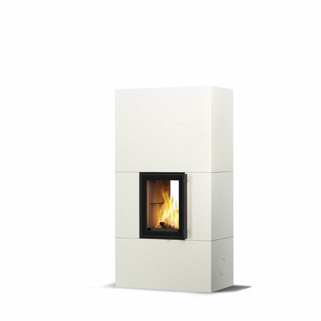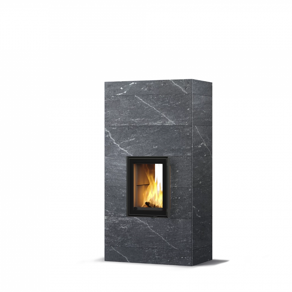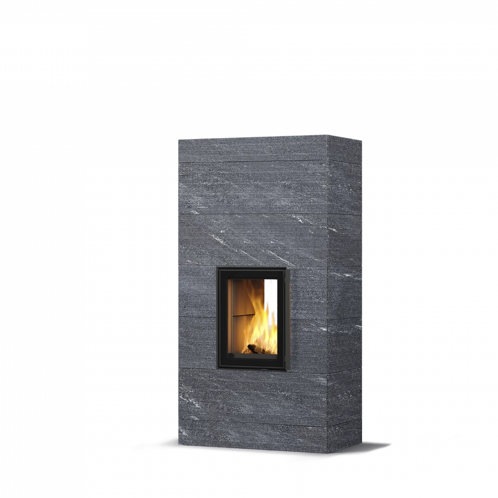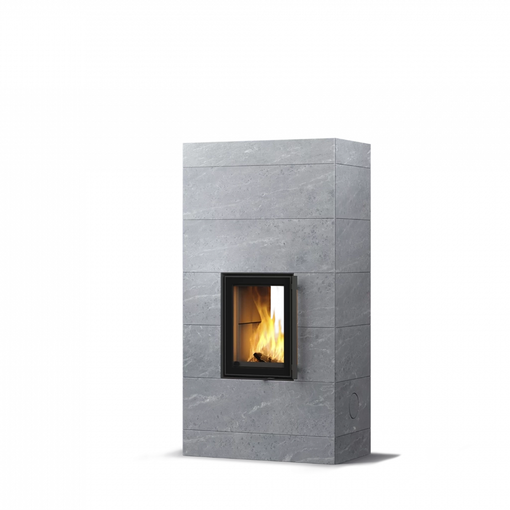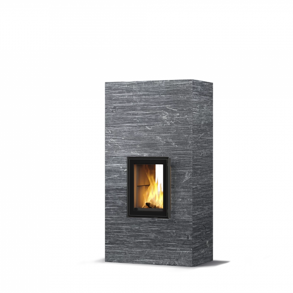 Kaminens yta består av naturlig täljsten, ett material känt för sin förmåga att lagra värme och avge den långsamt under många timmar. Välj mellan släta eller räfflade plattor, eller den grafiskt mönstrade Grafia-ytan – ett dekorativt alternativ framtaget med avancerad vattenskärningsteknik.
