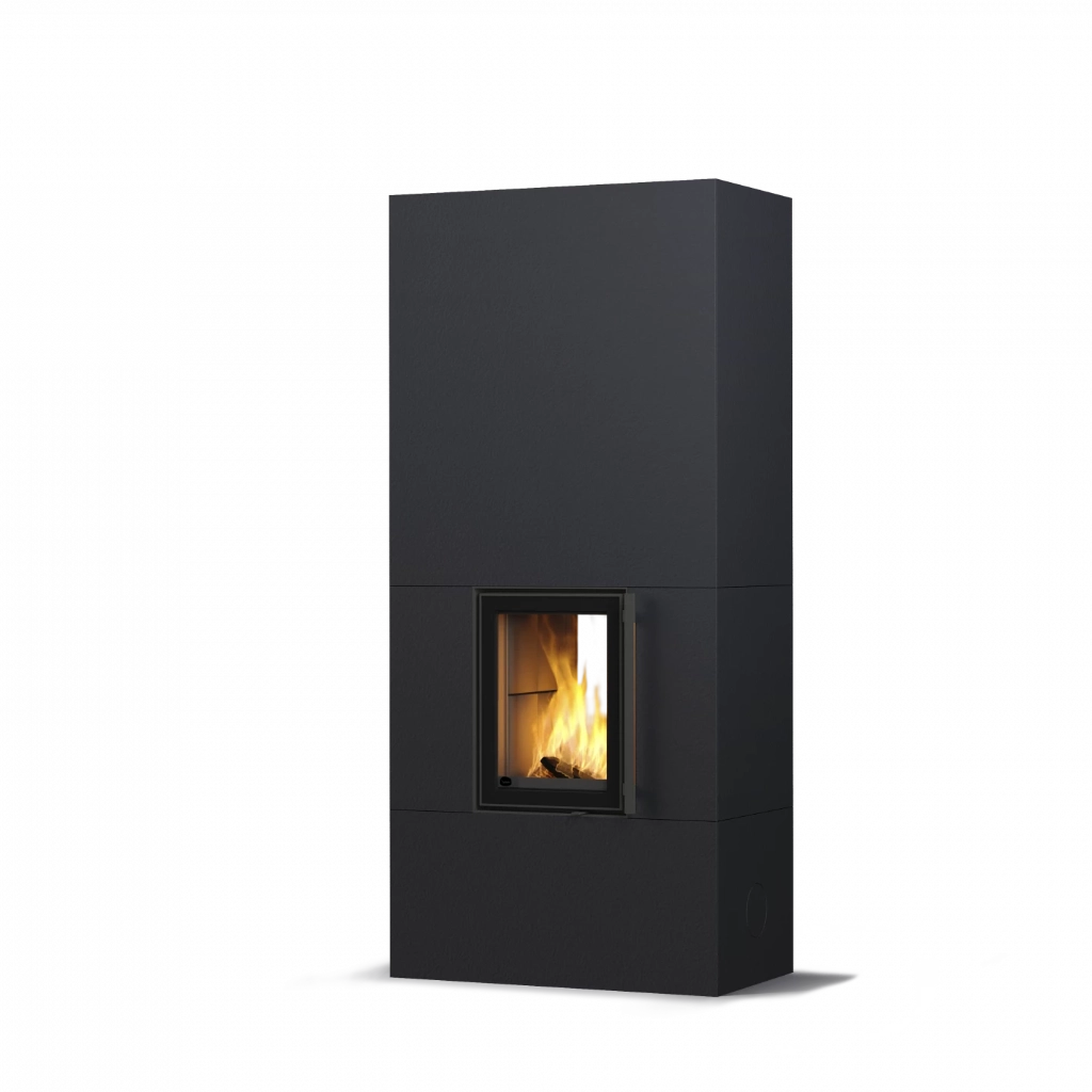 Den noggrant utförda plattsättningen i äkta täljsten följer luckans linjer och skapar ett enhetligt och rofyllt intryck. Välj mellan tre olika ytor: slät, räfflad eller det konstnärliga Grafia-mönstret – framtaget med avancerad vattenskärningsteknik. Varje alternativ ger kaminen sin unika karaktär och gör den enkel att anpassa till olika interiörer.