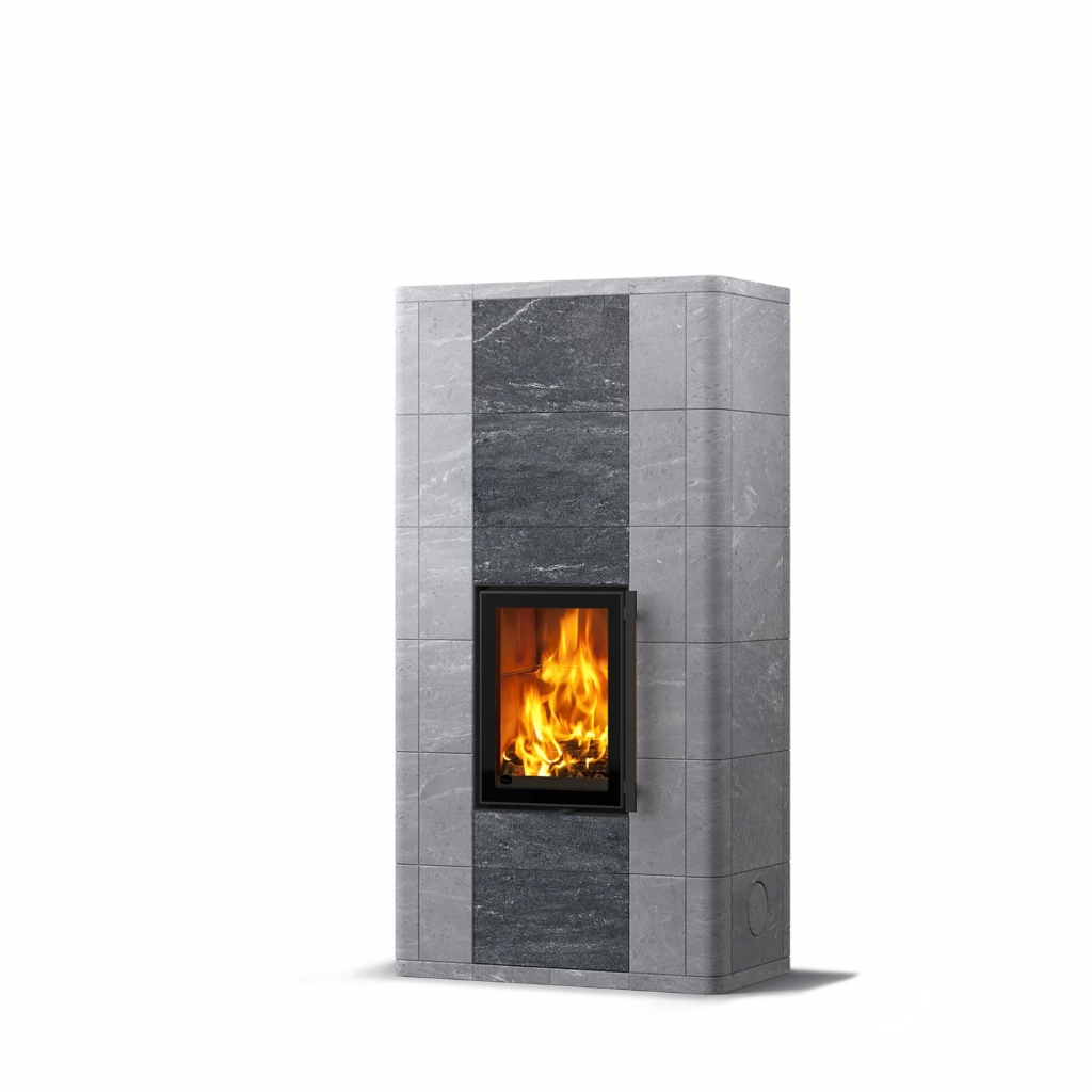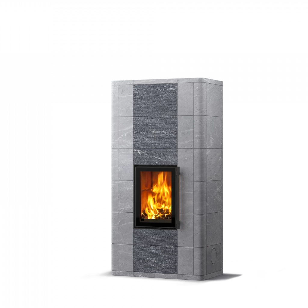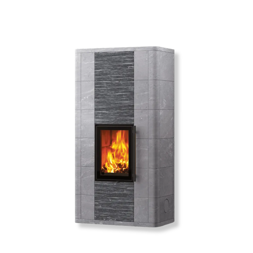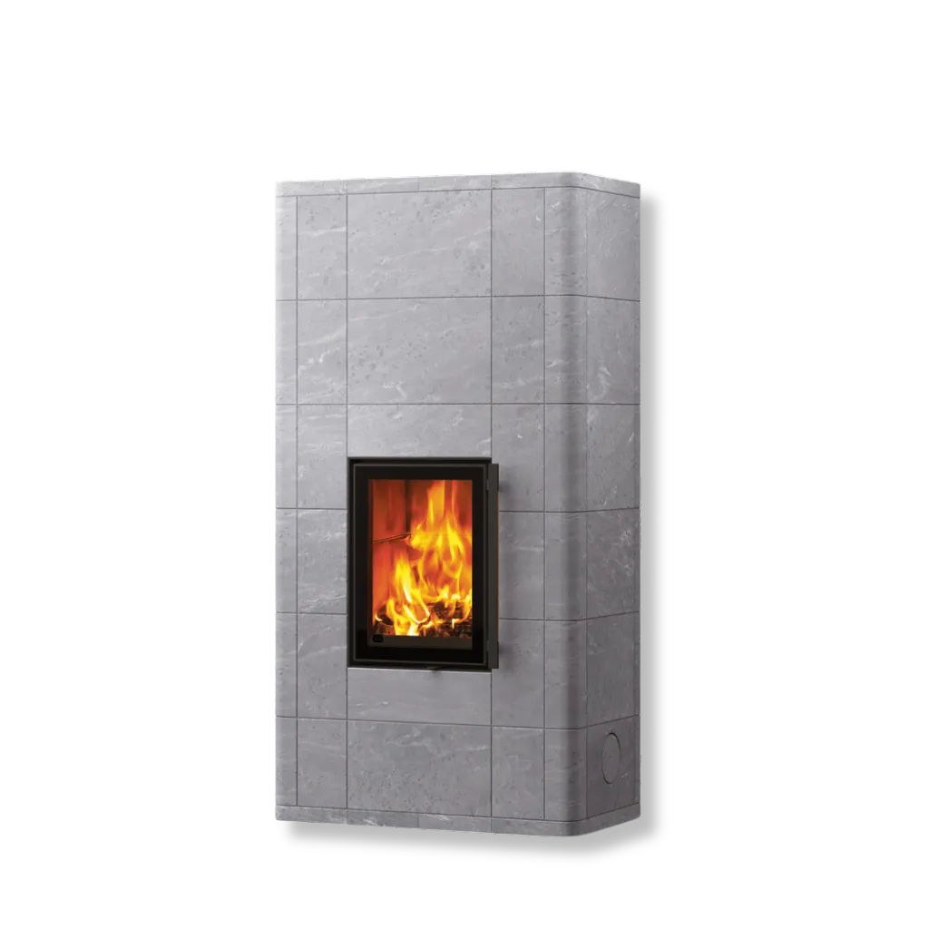 Ugnen är klädd i täljstensplattor i varierande storlekar, vilket ger en levande och elegant struktur. Ytan kan anpassas efter din stil – välj mellan helt släta plattor eller en kombination av släta och räfflade ytor. Den räfflade Grafia-ytan är unik, skimrande och formad med vattenskärning för en oregelbunden, taktil känsla.