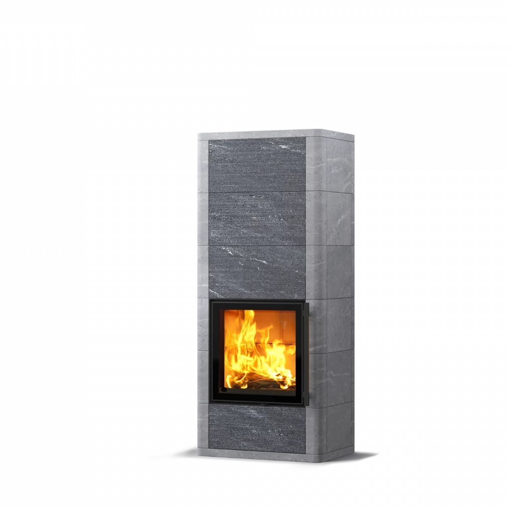 Kaminens kvadratiska lucka ramar in elden på ett elegant sätt och skapar en varm och inbjudande atmosfär i hemmet. Du kan anpassa ytan med antingen släta täljstensplattor eller en kombination av släta och dekorativa Grafia-stenar – vars oregelbundna prägling fångar ljuset och lyfter fram täljstenens naturliga skimmer.