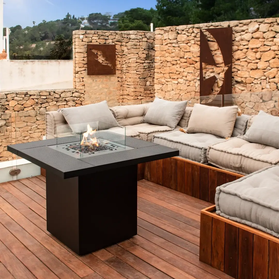 Den robusta konstruktionen i rostfritt galvaniserat stål står emot tufft väder året om, medan de härdade glaspanelerna skyddar lågorna från vind – och skapar en snygg 360° eldvy. Med den eleganta svarta finishen passar Square Table in i såväl moderna som klassiska utemiljöer.