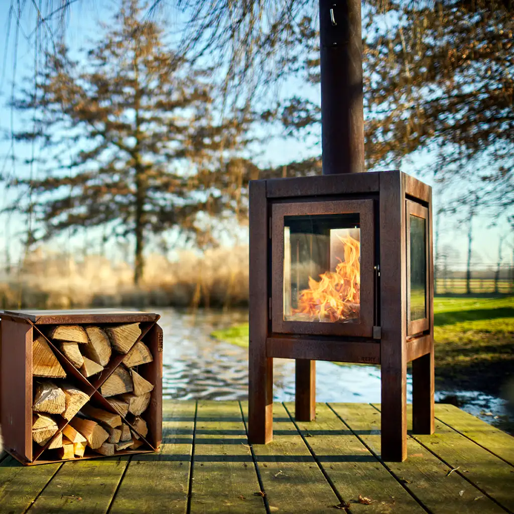 Kaminen är tillverkad i CorTen-stål, ett slitstarkt material som utvecklar en vacker, rostbrun yta med tiden. Den naturliga patinan skyddar mot väder och vind och ger kaminen sitt karaktäristiska, rustika utseende – lika elegant på en modern altan som på en lantlig terrass.