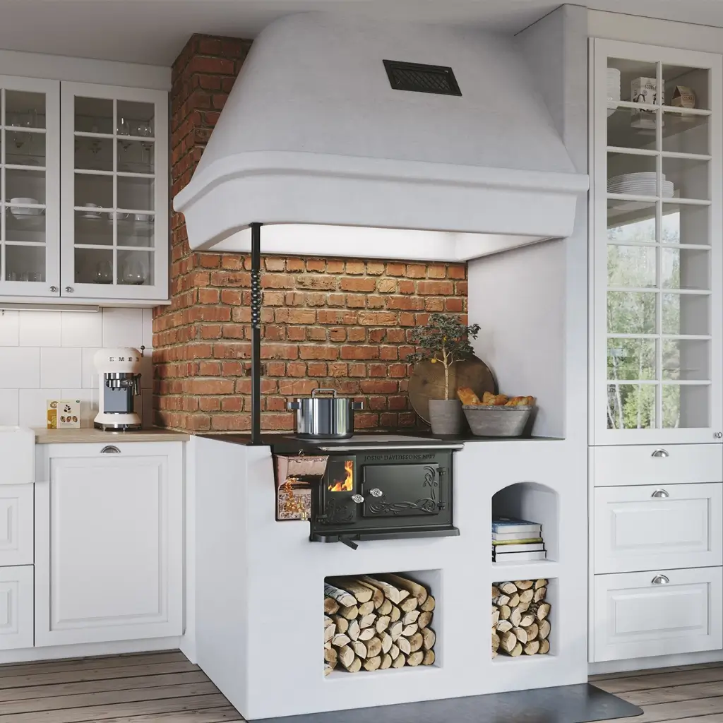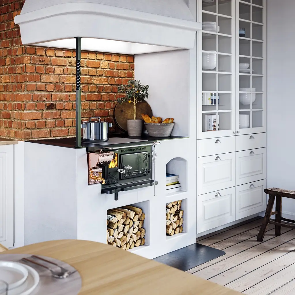 JD 227 är en stilfull vedspis i gjutjärn som förenar retrodesign från 50-talet med dagens effektiva förbränningsteknik. Med sina glasade eldstadsluckor och välgenomtänkta detaljer blir den snabbt en central del i köket – oavsett om du har modern eller traditionell inredning. Den kan placeras som fristående spis på benstativ eller byggas in i en murad köksmiljö – möjligheterna är många.
